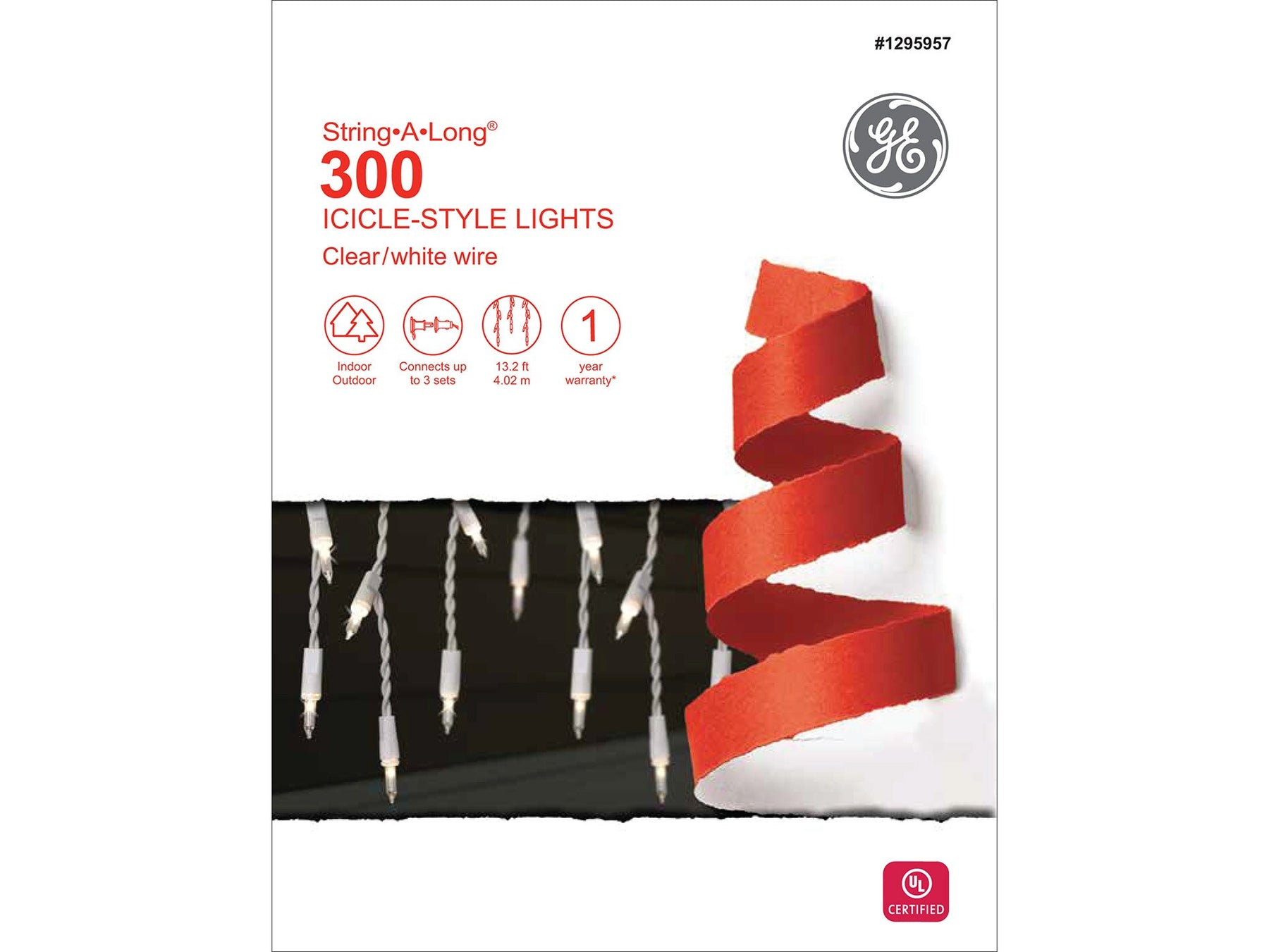 Classic GE String-A-Long icicle lights deliver warm, constant clear illumination on a white cord for a clean holiday look. The 300-count incandescent set features 13.2 ft lighted length and connects up to 3 sets for easy coverage indoors or out.