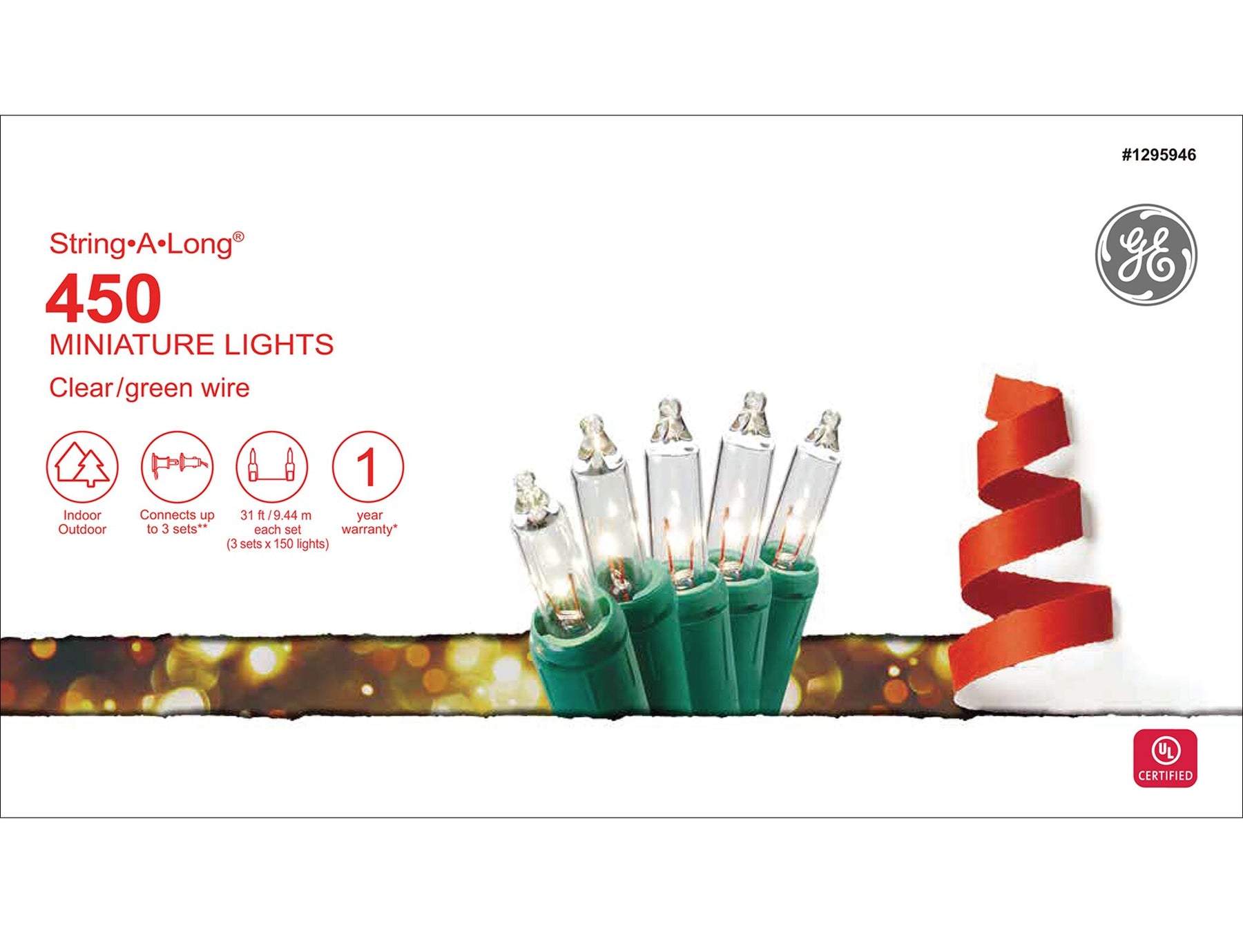 Brighten your holiday décor with GE’s String‑A‑Long 450-count clear incandescent mini lights. This 93‑ft lighted strand features a green cord with fused plug, indoor/outdoor rating, and linkable design for easy, continuous runs.