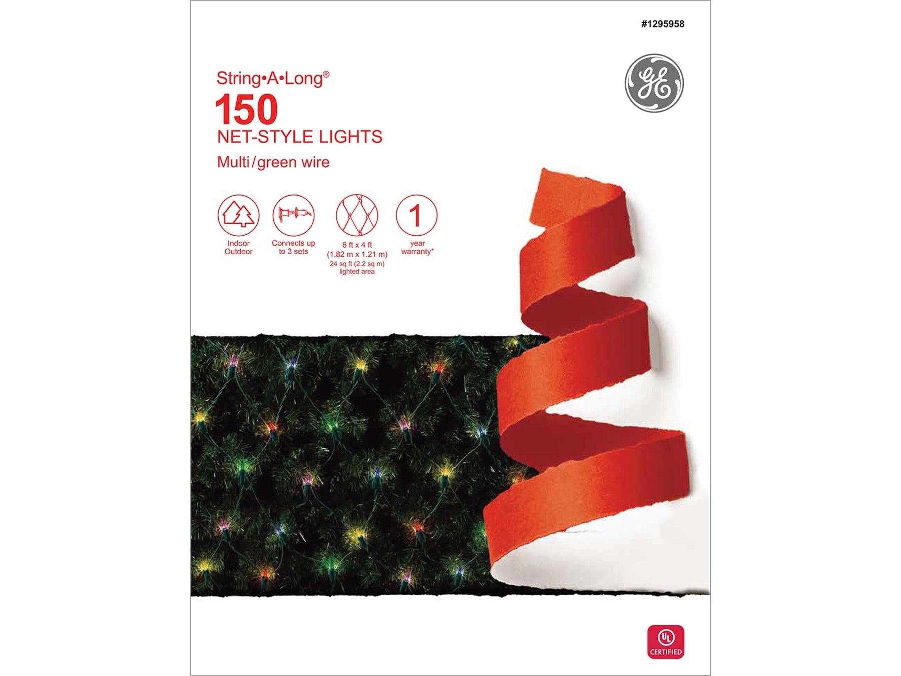Brighten shrubs and railings with GE String-A-Long net lights featuring 150 multicolor incandescent mini bulbs on a green cord. The 6-ft x 4-ft net provides uniform coverage and a constant glow for indoor or outdoor holiday decorating.