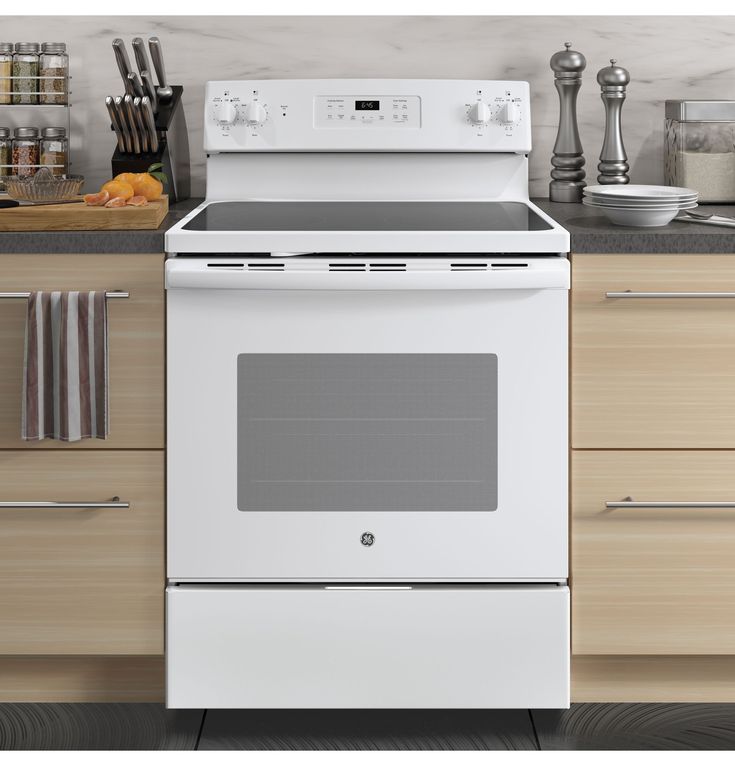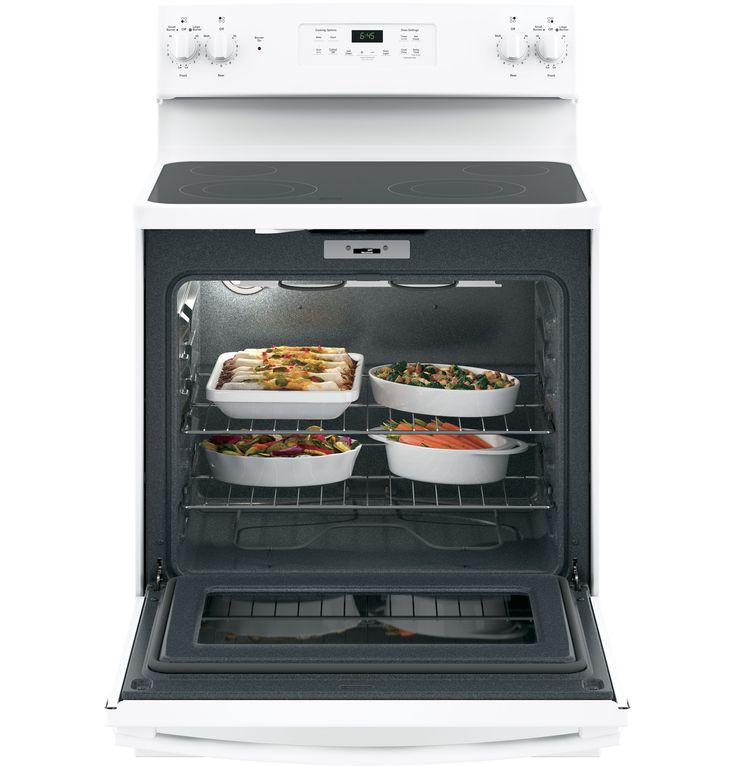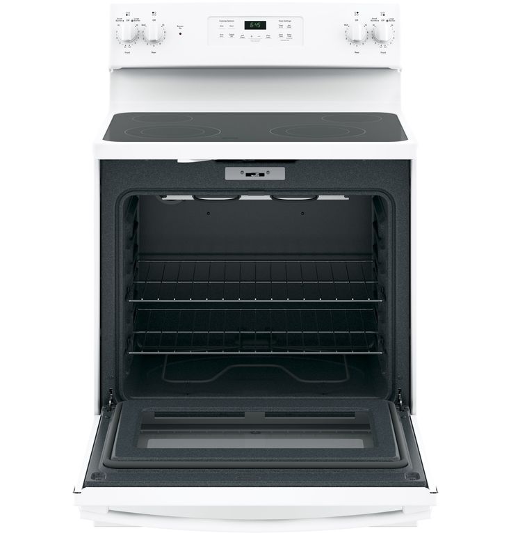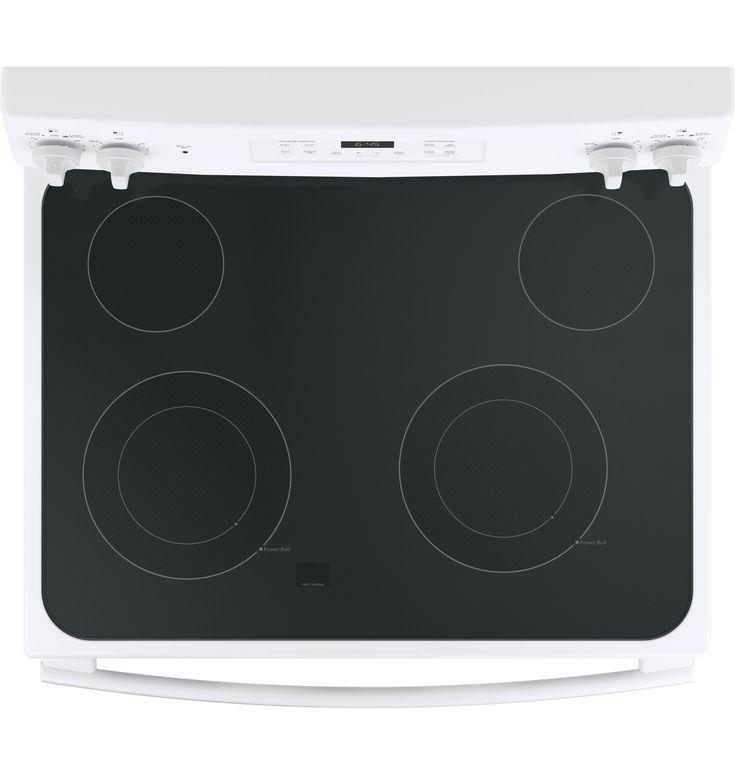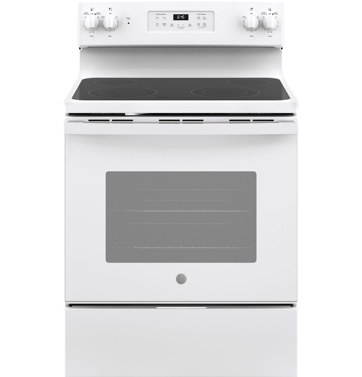 5.3-cu ft capacity oven accommodates several dishes at once for ease and convenience 4 cooktop elements, including two 9-in/6-in PowerBoil elements that are adjustable to fit your cookware Dual-element bake feature provides upper and lower elements for even heat distribution, so casseroles and cakes come out perfectly 2 oven racks with 6 possible positions adjust to suit your baking needs Automatic shut-off feature prevents unintended or unsupervised use Self-cleaning feature means no scrubbing is necessary to maintain a clean oven Ceramic glass cooktop is both sleek and simple to clean Removable storage drawer is a handy place to keep pots, pans and kitchen accessories White exterior adds a fresh, bright look to your kitchen