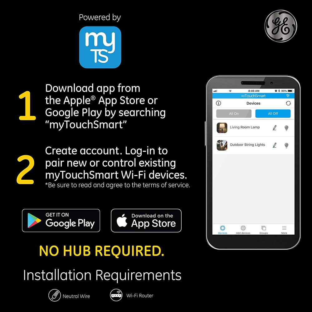 Upgrade any room with this GE myTouchSmart in‑wall Wi‑Fi smart outlet. It delivers one always‑on receptacle and one app‑ and voice‑controlled receptacle for schedules, countdowns, and manual on/off. Easy to install with a neutral wire, the tamper‑resistant duplex is ideal for lamps and small appliances and works with Alexa and Google Assistant.