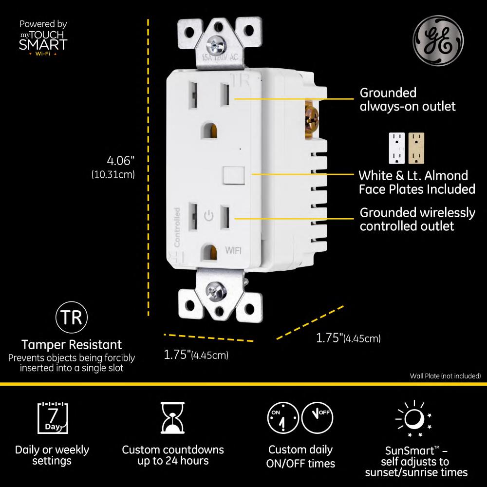 GE myTouchSmart Wi‑Fi Smart Duplex Outlet, 15A, White (Model 40795-S1)
