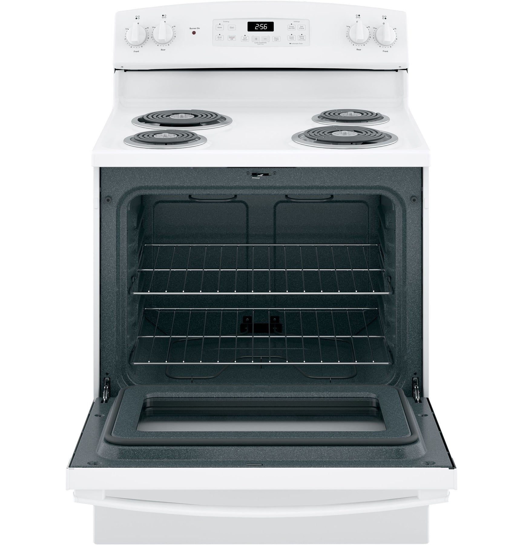 This GE 30-inch freestanding electric range offers a spacious 5.0-cu ft oven with self-cleaning convenience and a reliable coil cooktop. Dual-element bake delivers even heating, while an adjustable-height design and full-width storage drawer make everyday cooking simple and organized.