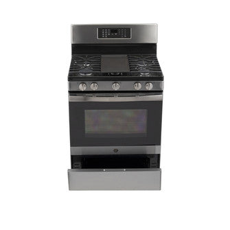 This 30-inch GE gas range features a spacious 5.0 cu. ft. convection oven with self-clean and steam clean, plus No Preheat Air Fry for crispy results fast. The edge-to-edge cooktop includes an integrated griddle, heavy-duty dishwasher-safe grates, and a powerful 18,000-BTU Power Boil burner.