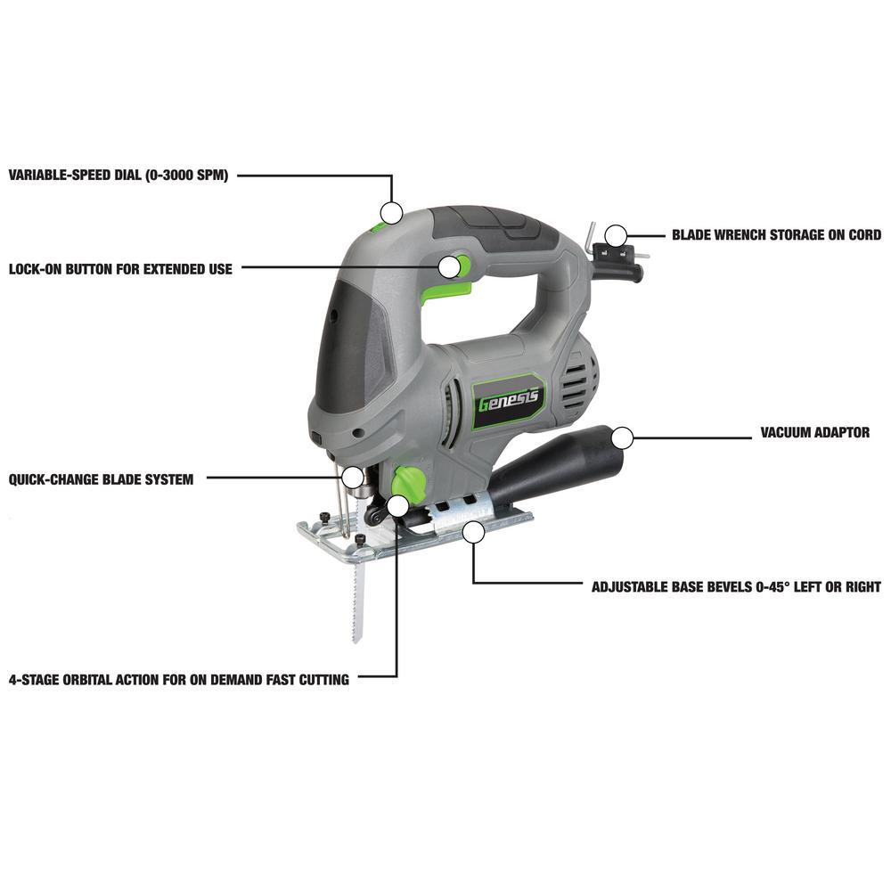 The New Genesis GJS500 is equipped with 5.0 Amp of variable speed power. A 4-Position orbital action directs the 0-3000 SPM jig saw blade for the desired beveled and curved cut. The quick change blade system is perfect for switching blades in the middle of a project with the included wood and metal cutting blades. A Rip guide, vacuum adapter, Allen wrench, and wood and metal cutting blade pair are included. Make the NEW Genesis GJS500 5.0 Amp Jig Saw part of your tool collection today.