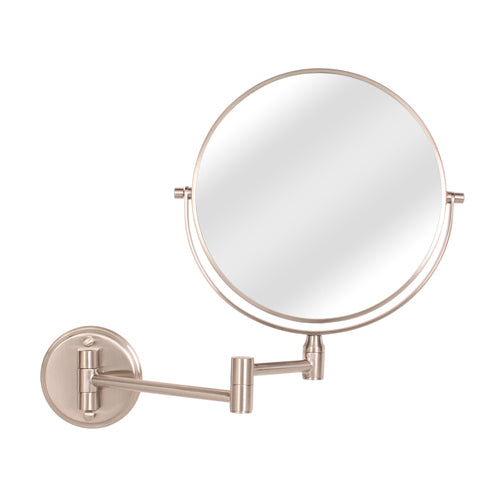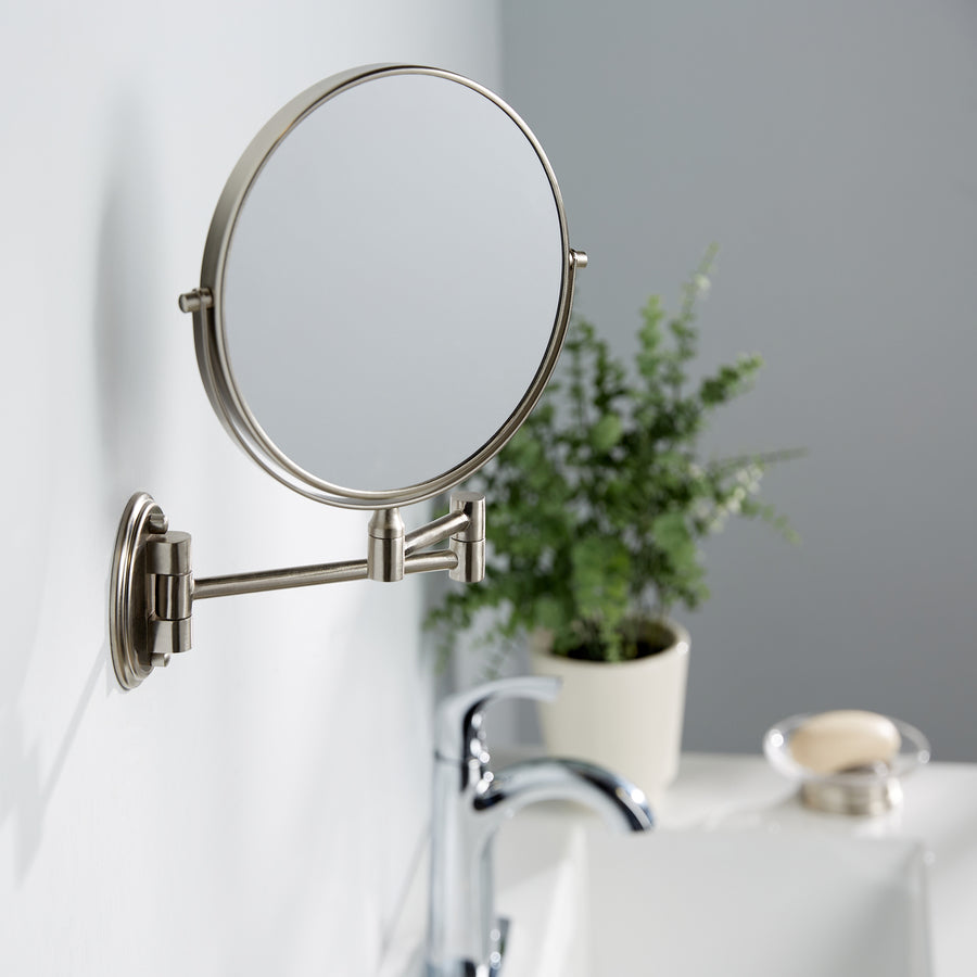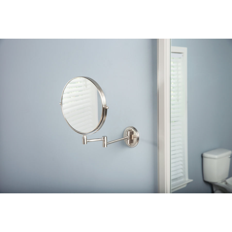 Standard and 5 times magnification 8-Inch dual sided mirror Mirror swivels and rotates to any angle Extends 10-in from wall Easy to mount with hardware included