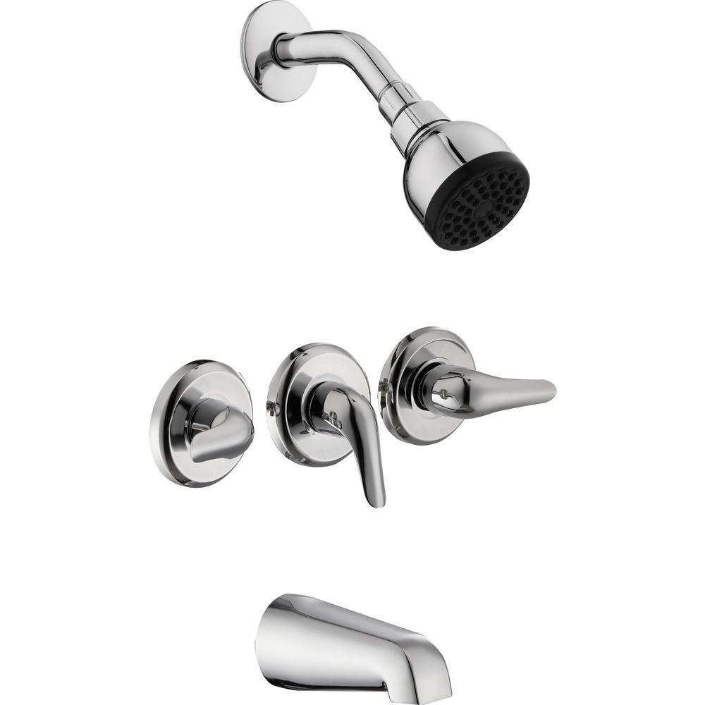 The Glacier Bay WaterSense Aragon 3-handle 1-spray tub and shower faucet in chrome is practical and attractive and will complement a wide variety of bathroom decor. WaterSense certified, this faucet has a 1.8 GPM rate to help reduce water use. The 3-handle lever handle design allows you to precisely control water flow and temperature, while the single-function shower head provides consistent water flow for an enjoyable shower experience. Durable with an easy to clean chrome finish. Pair with other pieces from the Aragon Collection for a complete and polished look.
