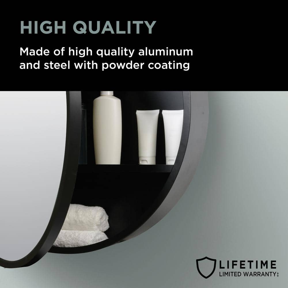 The Glacier Bay Round Matte Black Medicine Cabinet combines a sleek, modern look with practical functionality, perfect for enhancing any bathroom. Featuring a durable aluminum frame and sturdy steel body, this cabinet offers style as well as easy surface-mount installation with two interior shelves for organized storage. Enjoy peace of mind with its lifetime limited warranty.