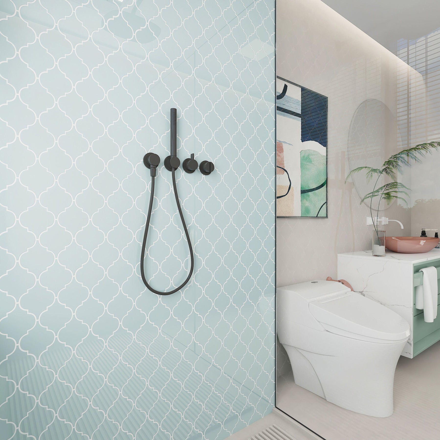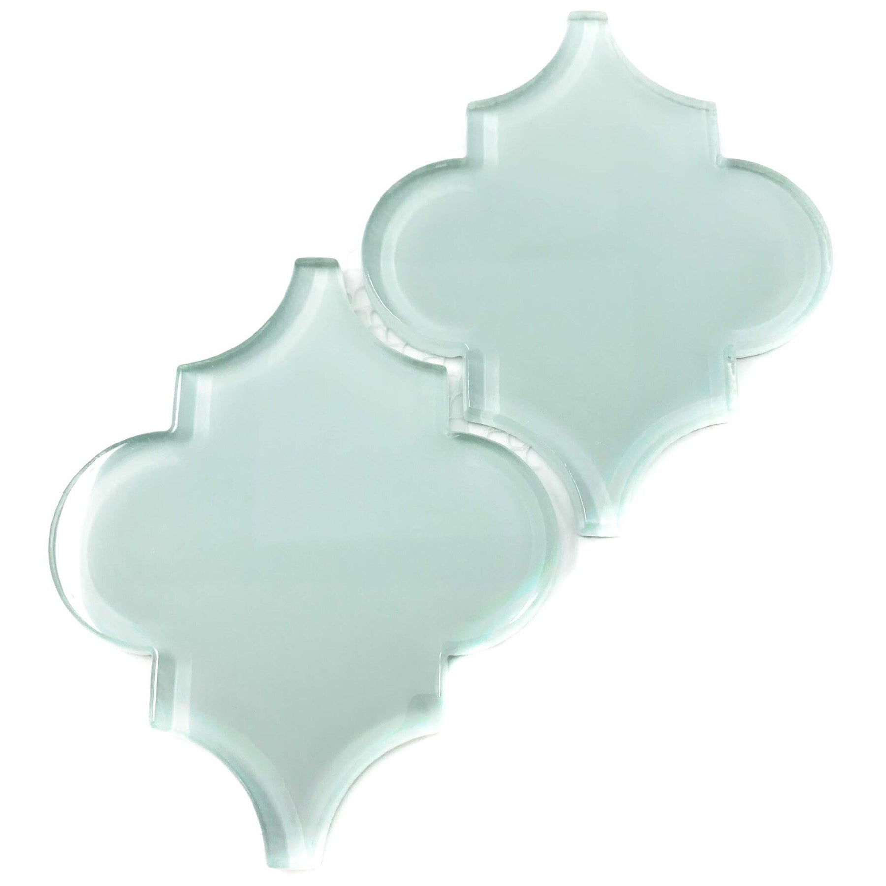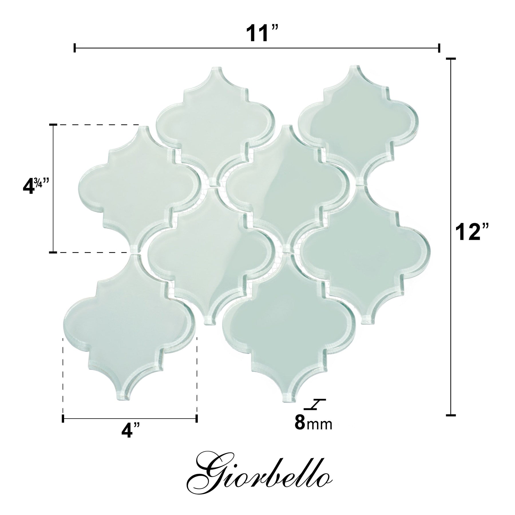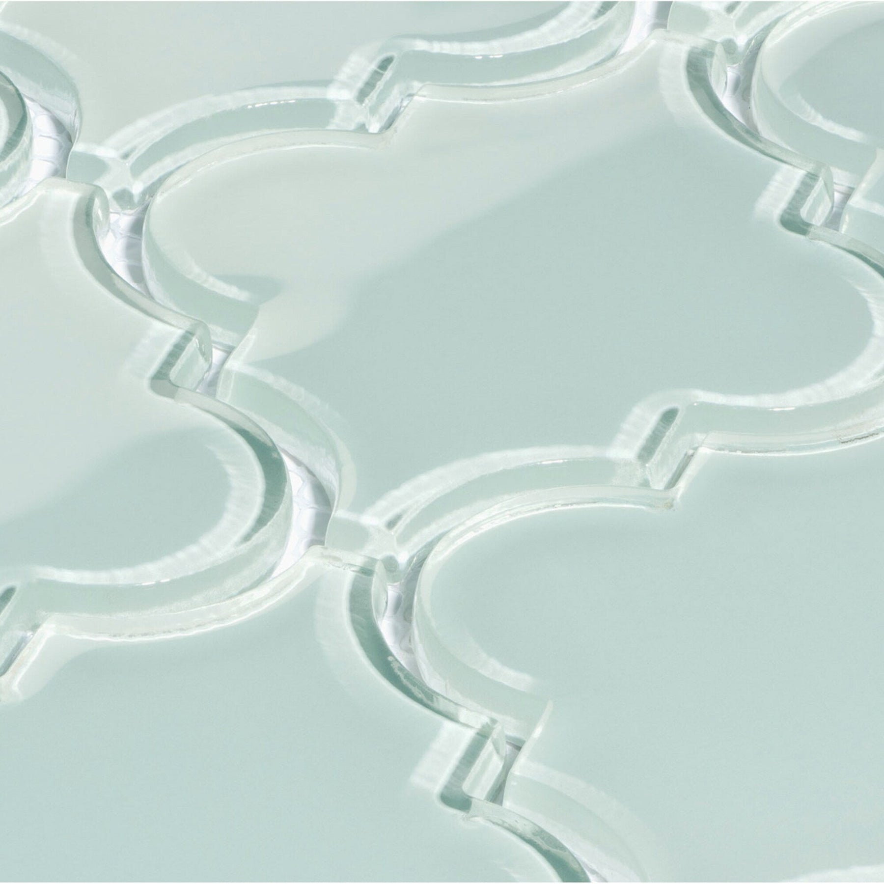 Enhance your space with the Giorbello Glass Arabesque Wall Tile in a serene baby blue. Crafted from high-quality, glossy, waterjet-cut glass, these tiles provide a sophisticated style perfect for both residential and commercial applications. Their mesh backing ensures easy installation and a standout look that's both water-resistant and durable.