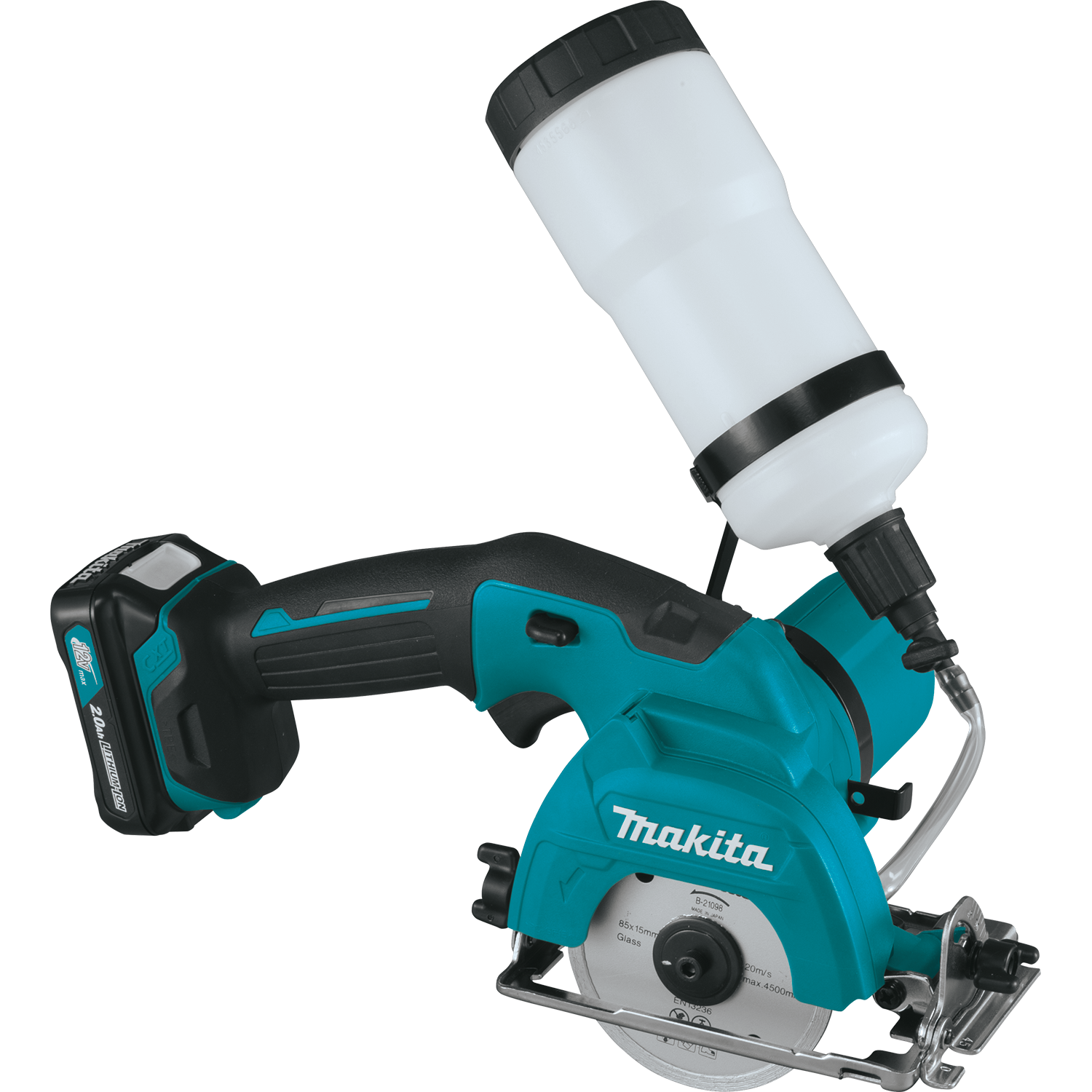 Compact and maneuverable, this Makita 12V max CXT cordless tile and glass saw delivers smooth, controlled cuts with a 3-3/8 in. blade and onboard 16.9 oz water tank for wet cutting. Designed for precision, it offers up to 1 in. cutting depth and a nickel‑plated tilting base for bevel cuts.
