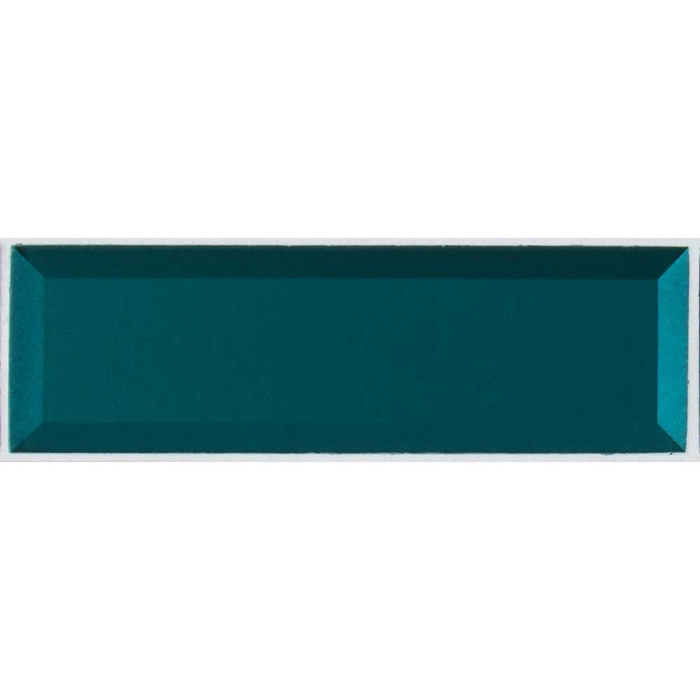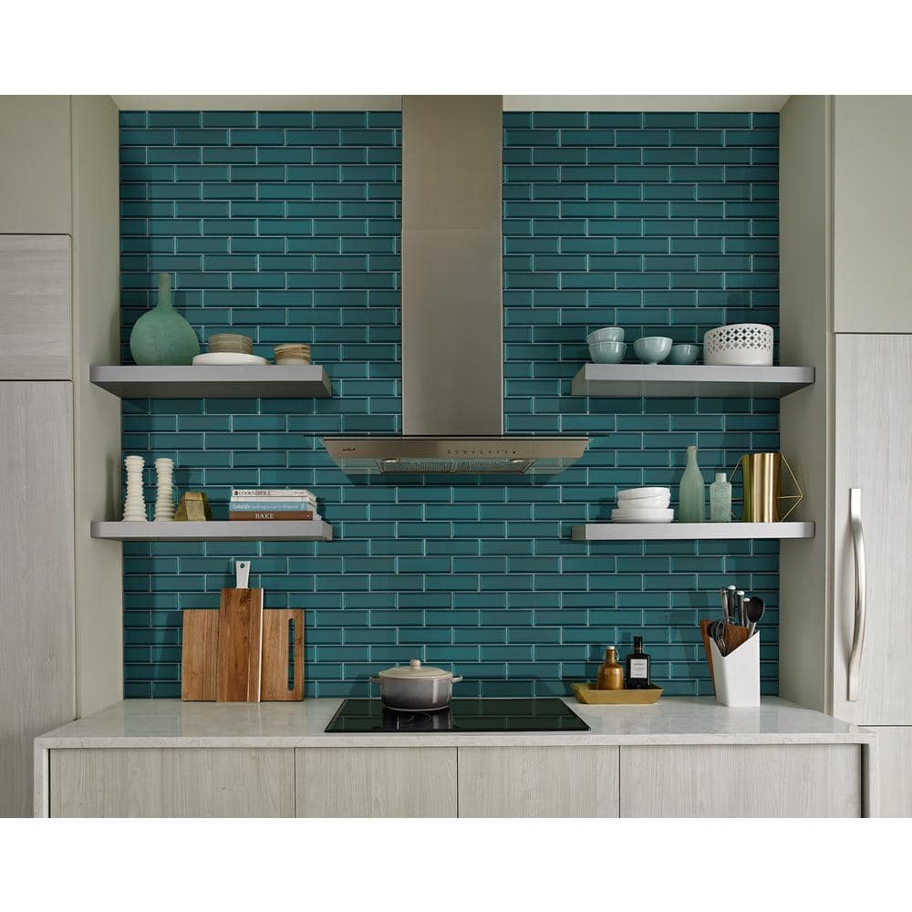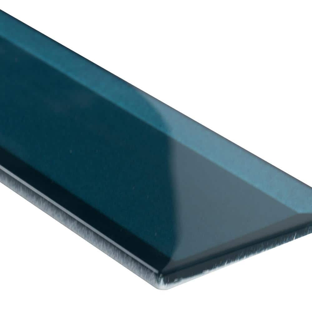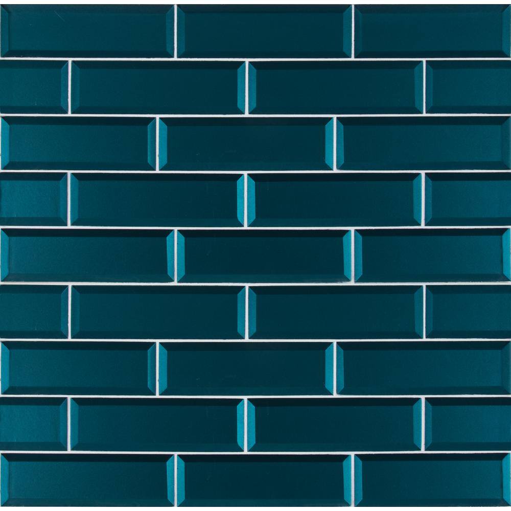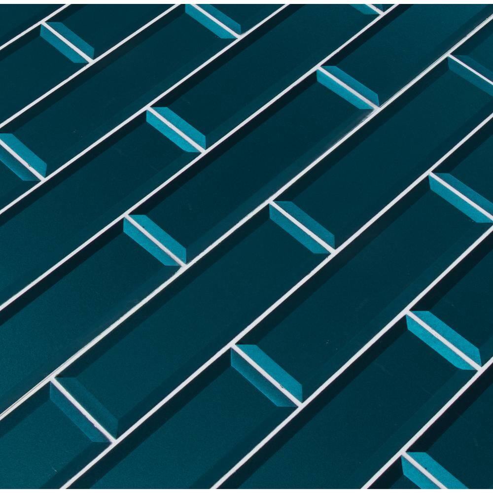 A sleek beveled glass subway tile in rich Verde Azul adds bold color and modern shine to backsplashes, showers, and accent walls. The 2.5 x 8–9 in. format delivers a classic stacked look with a high-sheen finish and durable, frost-resistant construction.