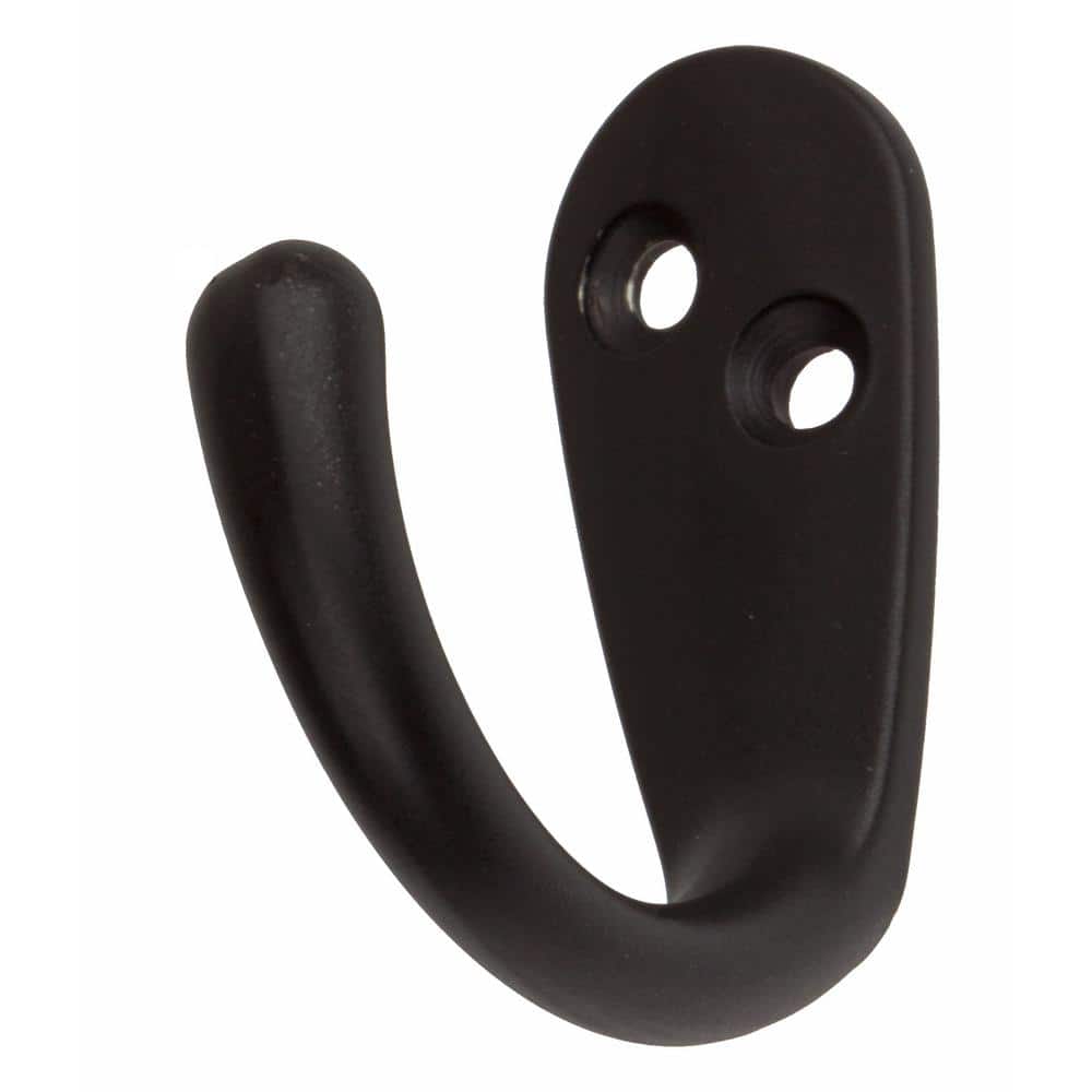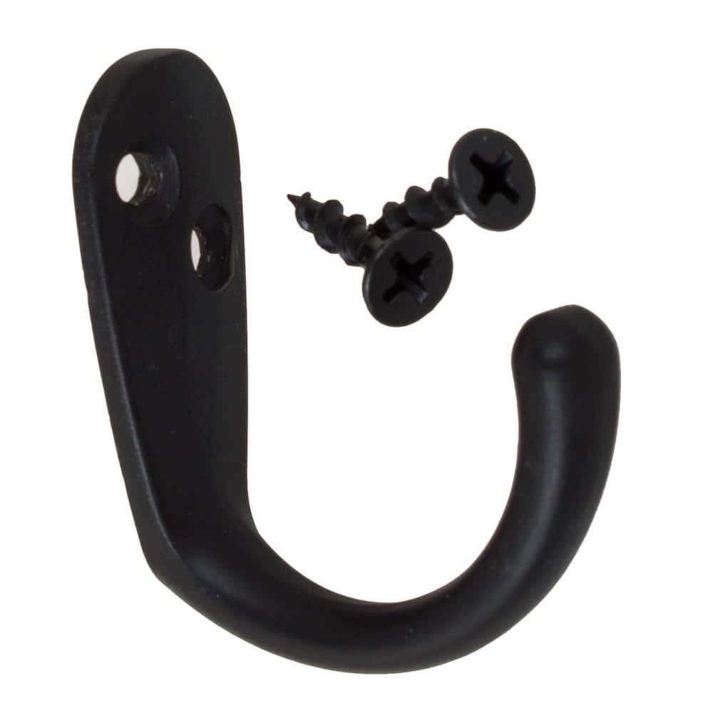 Compact zinc die-cast robe/coat hooks with a matte black finish for sleek, durable storage. Wall-mounted single hooks include color-matching wood screws for quick, secure installation in closets, bathrooms, or entryways.