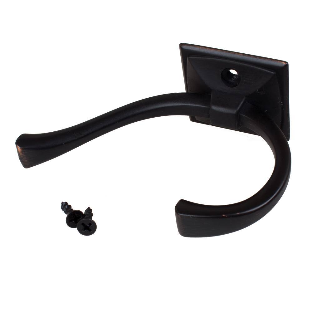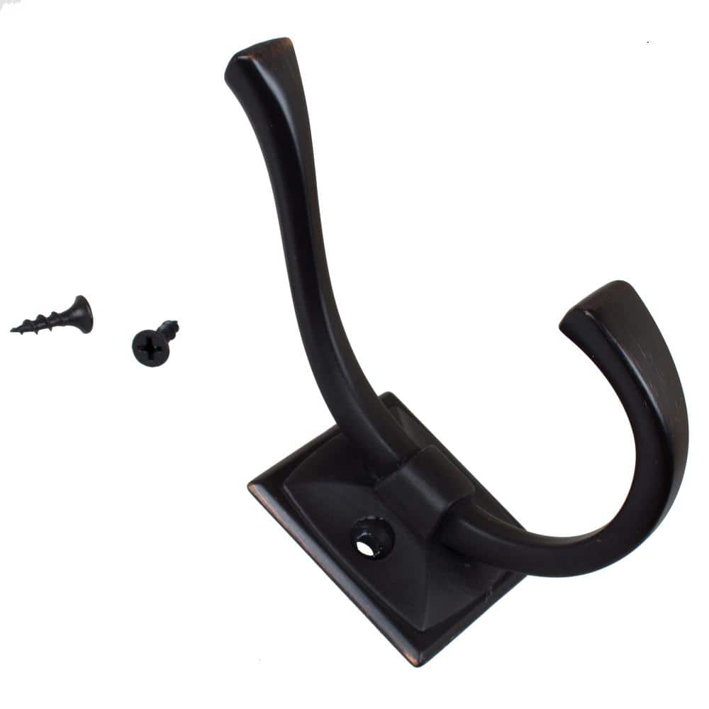 A 10-pack of flared double-prong hooks in an oil rubbed bronze finish for coats, hats, and towels. Constructed from die-cast zinc alloy with wall-mount, screw-in installation and color-matching wood screws included.
