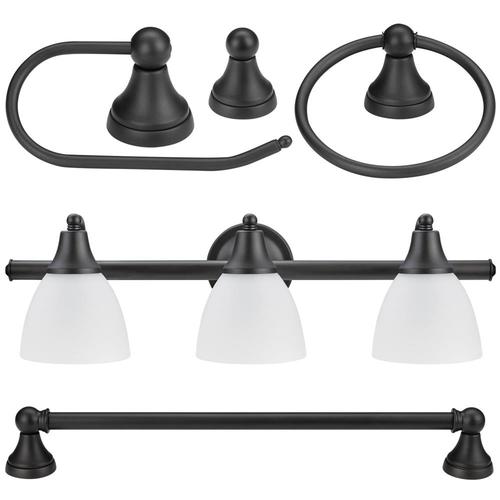 ALL IN ONE: update your bathroom easily with a matching 3 light vanity fixture, towel bar, toilet paper holder, towel ring and robe hook with a bronze finish CLASSIC DESIGN: with a clean, simple, classic design this set will go with any dcor EASY INSTALL: includes all mounting hardware for quick and easy installation VERSATILE: use the pieces individually in bathrooms, kitchen or bedroom BULB REQUIREMENTS: 3x E26/Medium Base 60W Bulbs (sold separately) SUGGESTED BULBS: to give your vanity a beautiful soft white glow try product# 84029; to give your vanity a bright white light try product# 84030; change the Bulb, change the look with product# 01325