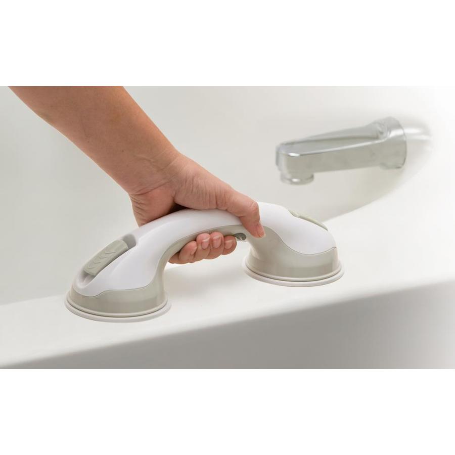 Suction cup design is easy to attach remove or relocate Enter a wet and slippery tub or shower safely with the Safe-er-Grip balance assist bar Flip up easy release tabs for easy Installation and removal Textured contoured rubber grip underneath handle provides a comfortable non slip grip which is perfect for the injured or elderly This balance assist grab bar is meant to be used on flat, non-porous surfaces and not on painted surfaces such as drywall For placement on tile, tile squares must be at least 4 in. x 4in. in diameter so that suction cups are not placed over grout lines as this will allow air to move under the suction cup thereby releasing its hold Balance bar is to be used only to assist and help balance a person body, not to stand full body weight, use with caution and always test the suction cups prior to each use To clean, simply wipe bar itself along with the underside of the suction cups with a wet warm cloth regularly Measures 12 in. in length