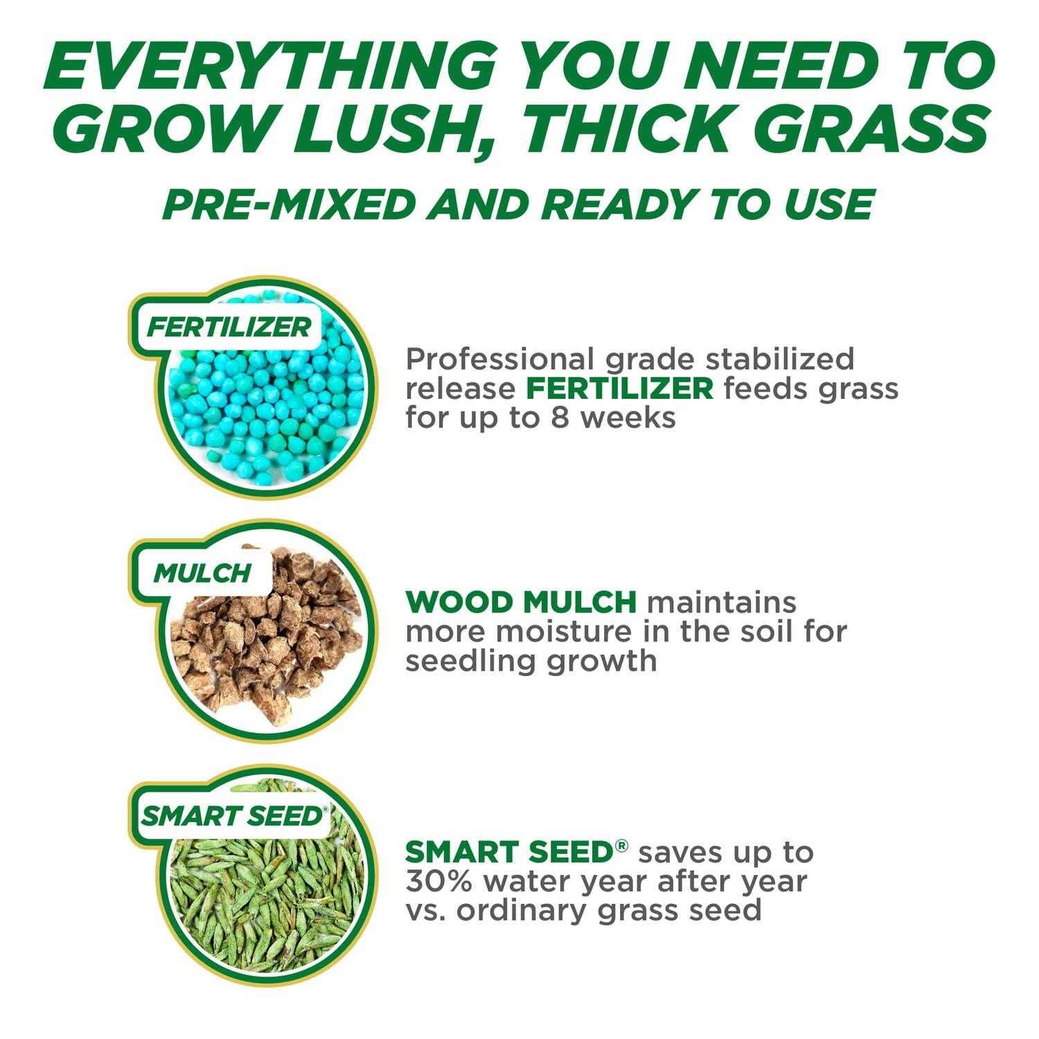 • Combination premium smart seed grass seed and professional-grade fertilizer and mulch