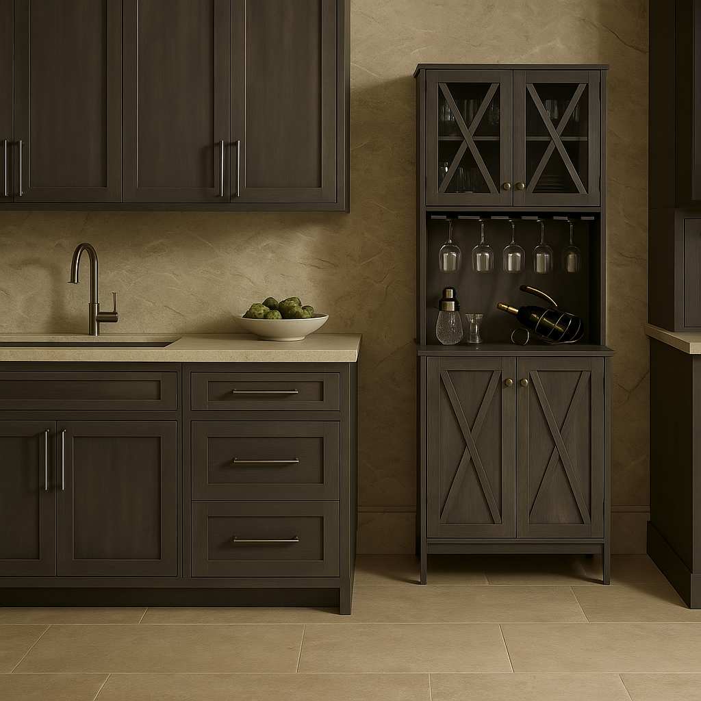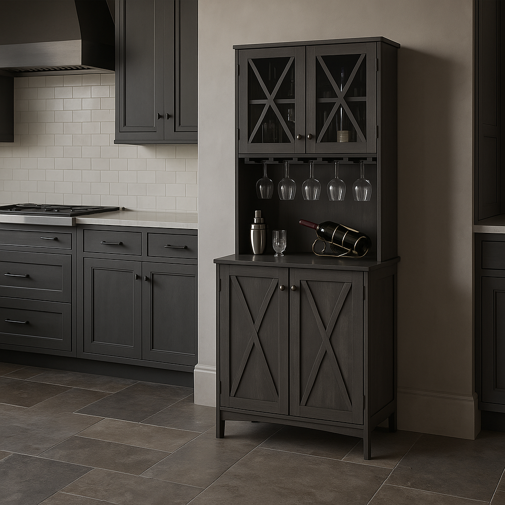 This charcoal gray kitchen cabinet is a masterpiece of modern design, blending rustic charm with minimalist sophistication. Its glass doors and wine racks create a striking visual appeal, while hidden shelves offer practical storage solutions. Style it in your dining room to showcase elegant tableware or in your kitchen for a chic organizational touch. This cabinet is not just furniture; it's a statement of refined living.