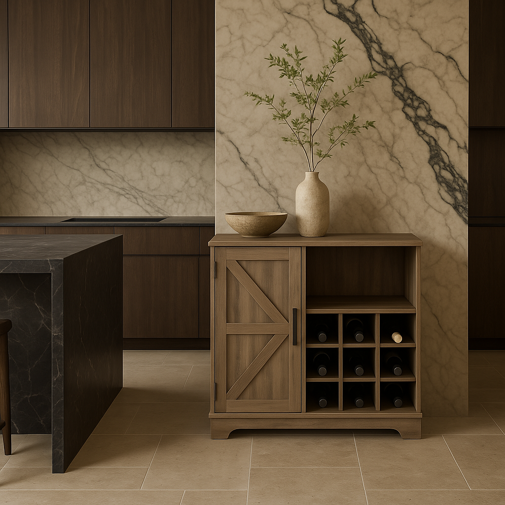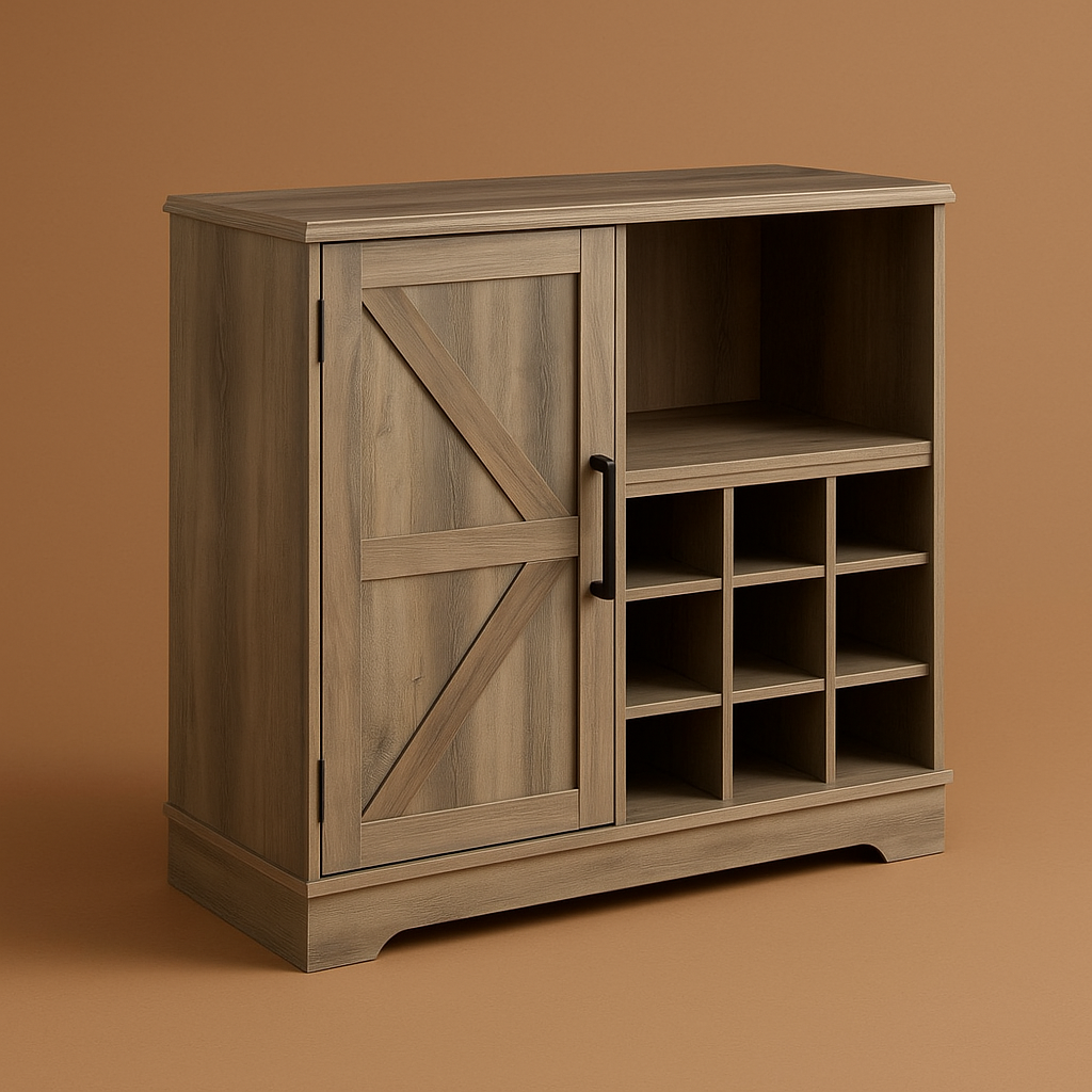 - Ample Storage: Includes 2 drawers, 1 barn-style door, and 12 wine racks.