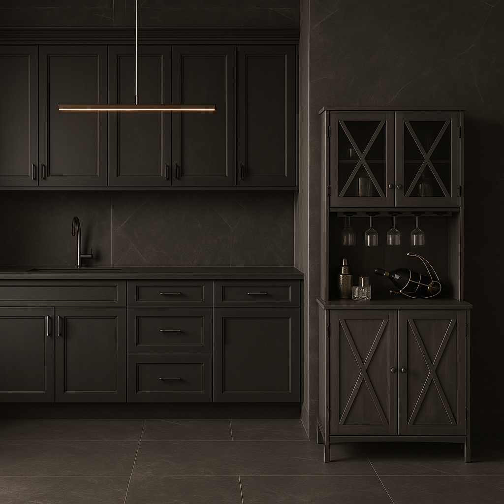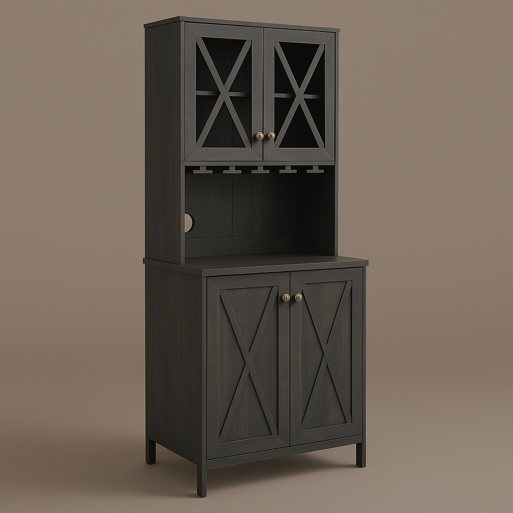 This charcoal gray kitchen cabinet is a masterpiece of modern design, blending rustic charm with minimalist sophistication. Its glass doors and wine racks create a striking visual appeal, while hidden shelves offer practical storage solutions. Style it in your dining room to showcase elegant tableware or in your kitchen for a chic organizational touch. This cabinet is not just furniture; it's a statement of refined living.