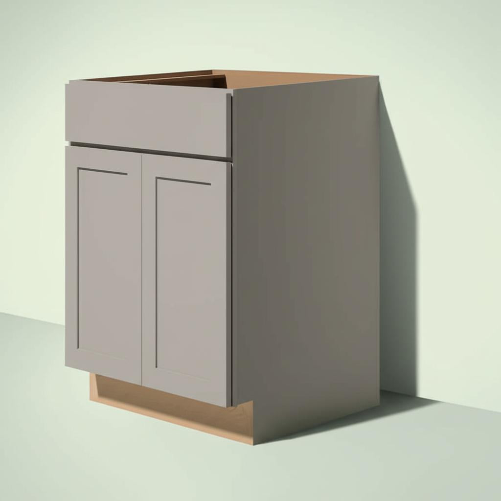 The Hampton Bay Courtland Shaker Base Cabinet in Sterling Gray combines modern style with durability. Featuring a timeless gray finish and robust composite construction, this cabinet is preassembled for hassle-free installation, enhancing both functionality and aesthetics in your kitchen.