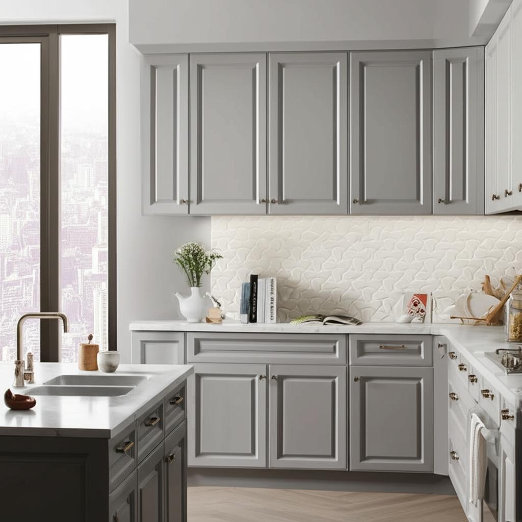 • Heron Gray Finish: Easy-to-clean thermofoil finish with a traditional raised door style enhances kitchen decor.