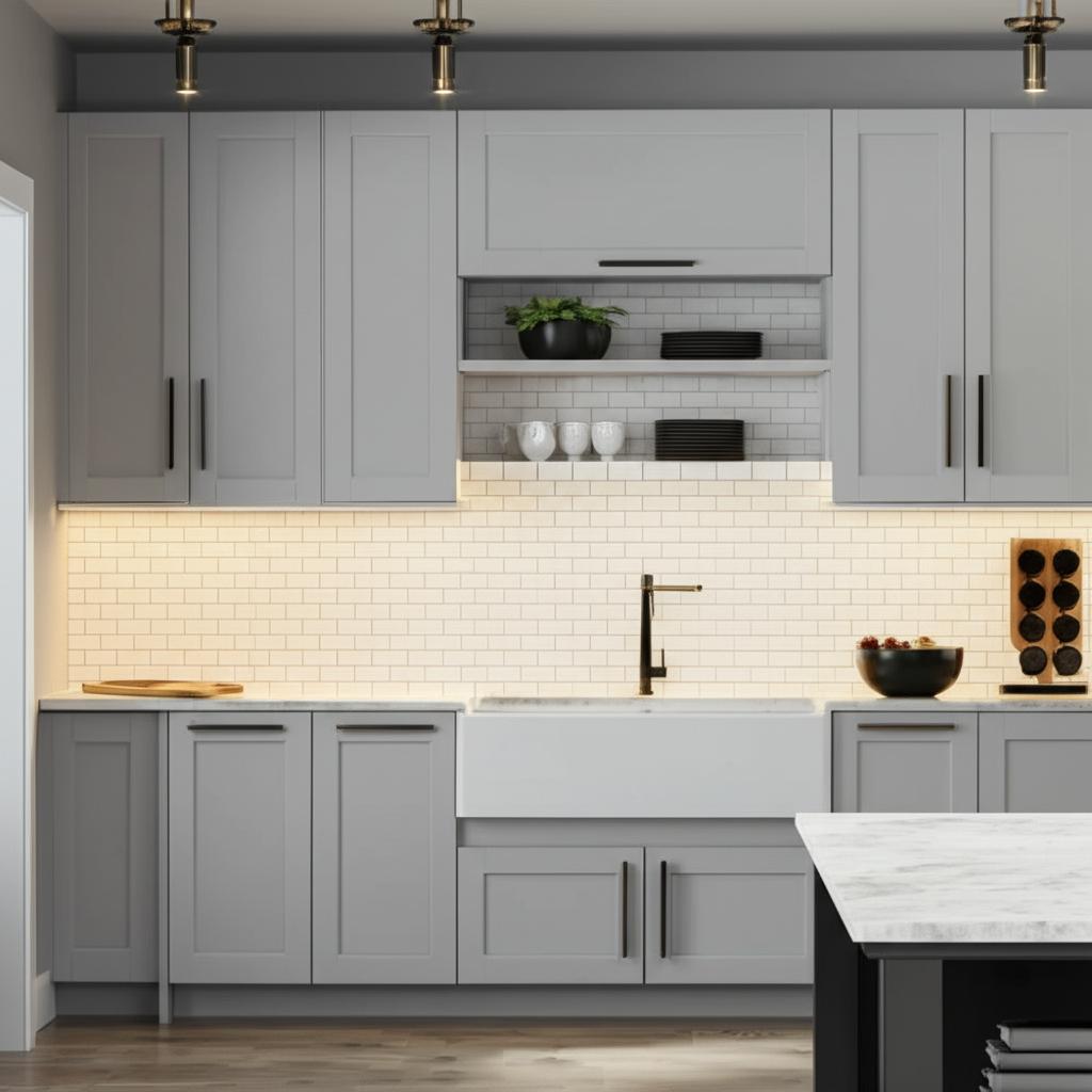 • Stylish Finish: Heron Gray thermofoil finish is easy to maintain and complements modern decor.