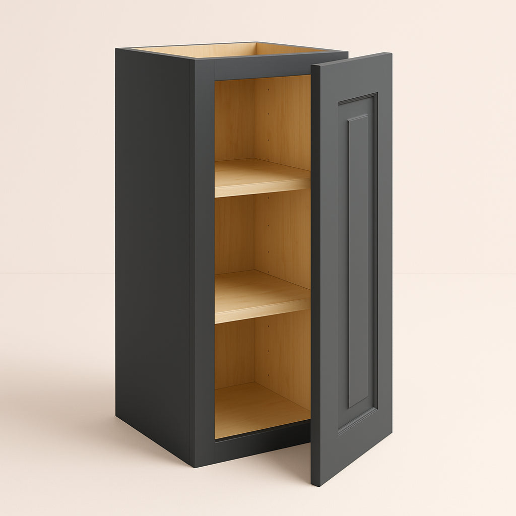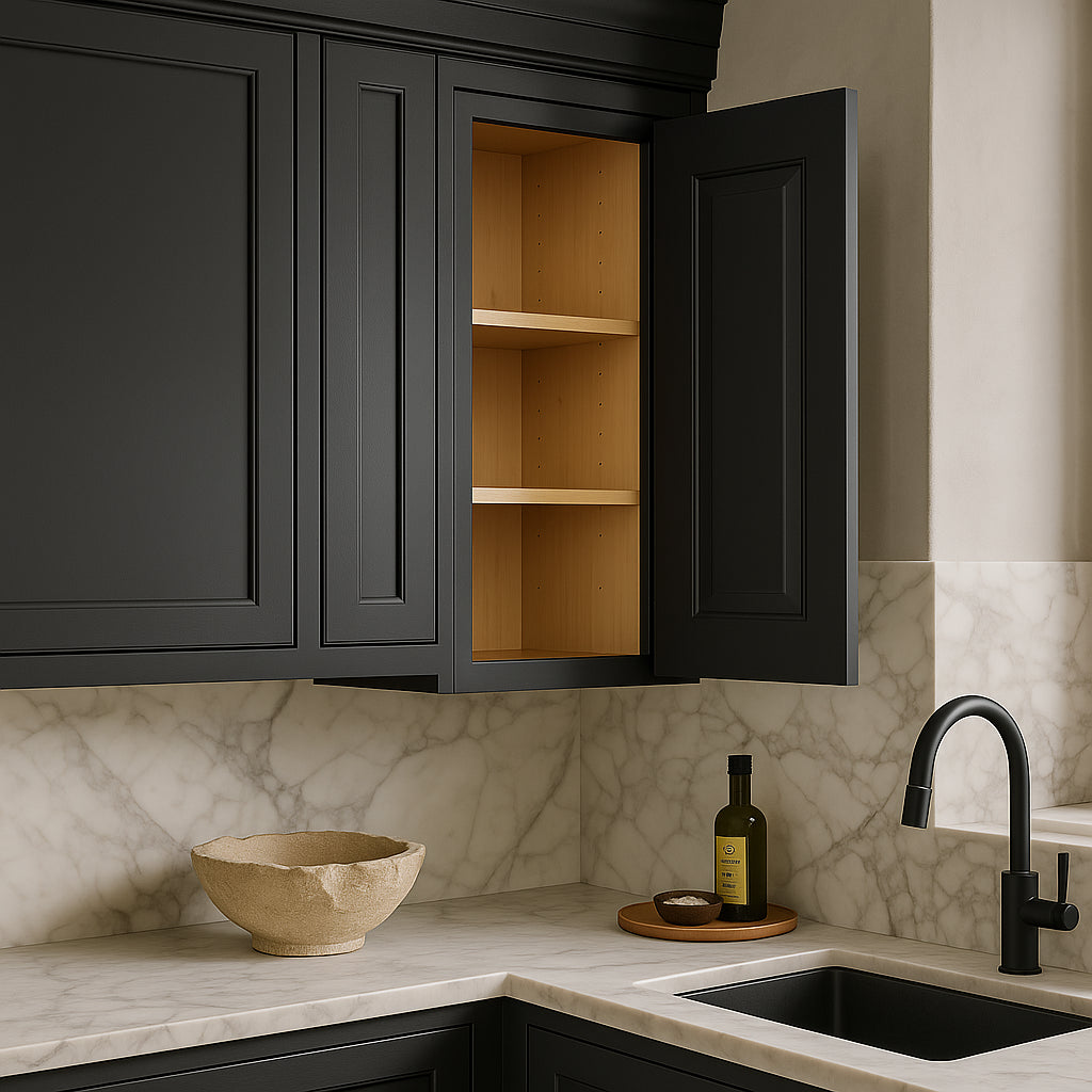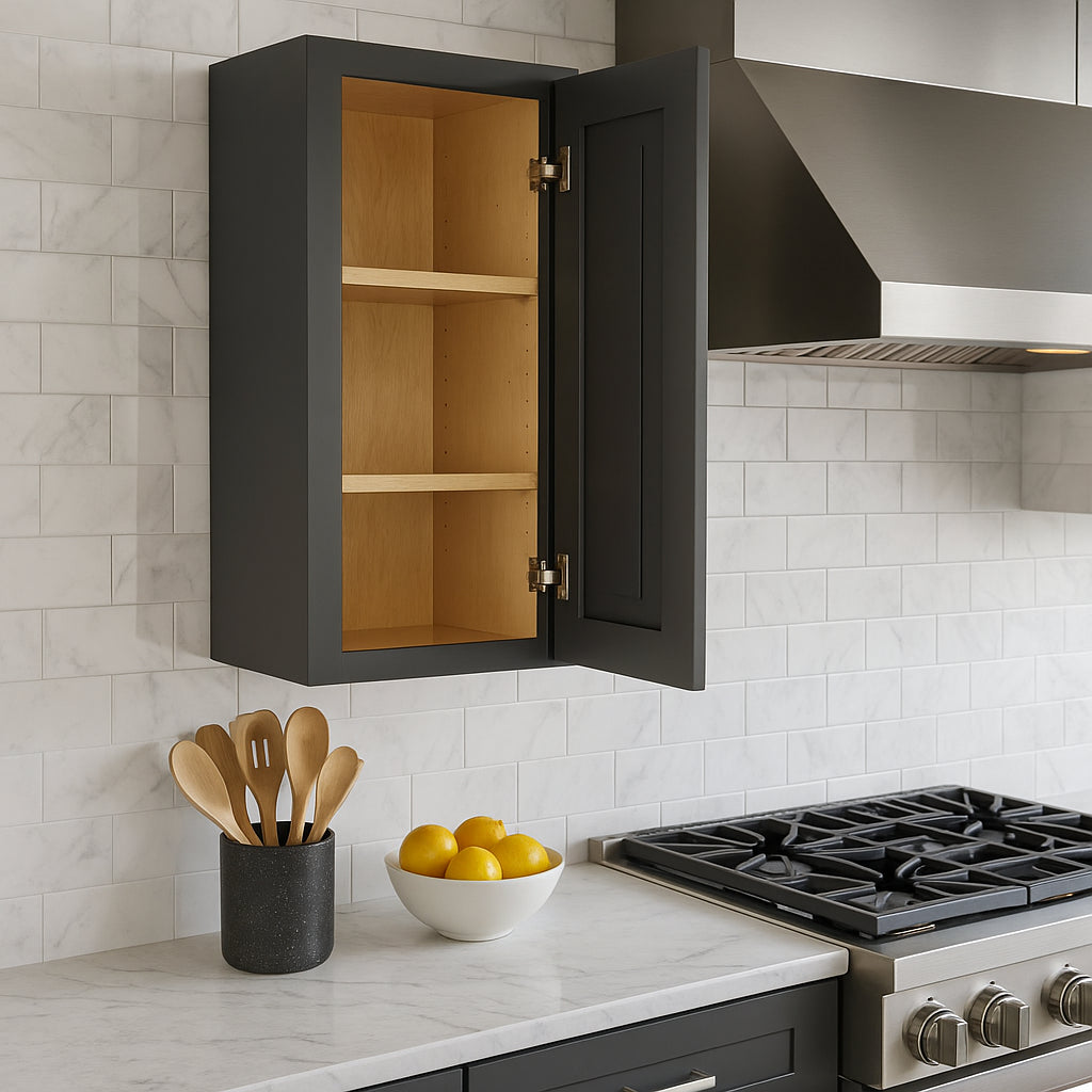The Grayson Deep Onyx Wall Kitchen Cabinet combines durable plywood construction with a sophisticated finish, featuring soft-close doors and adjustable shelves for versatile storage. Perfect for enhancing modern kitchen designs.