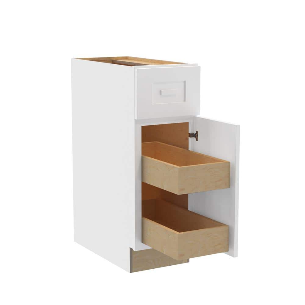The Grayson Base Kitchen Cabinet by Home Decorators Collection combines durable plywood construction with a sophisticated Pacific White finish. Featuring soft-close doors and drawers, it offers both style and functionality for modern and traditional kitchens.