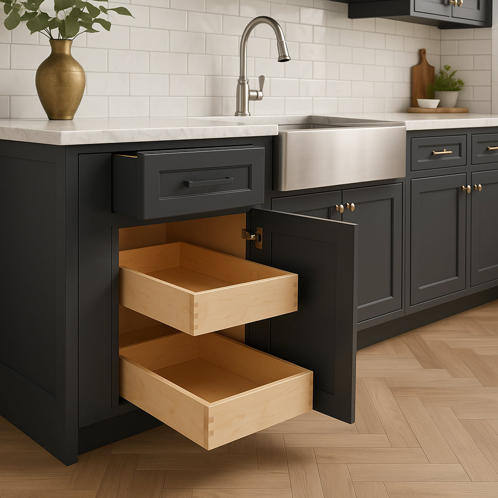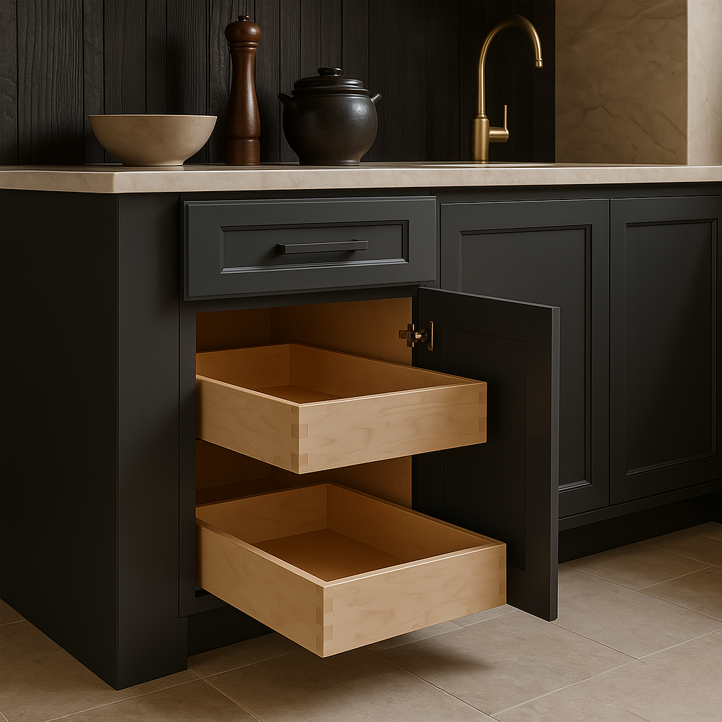 • Functional Storage: Equipped with two soft-close roll-out trays and a utensil tray insert.