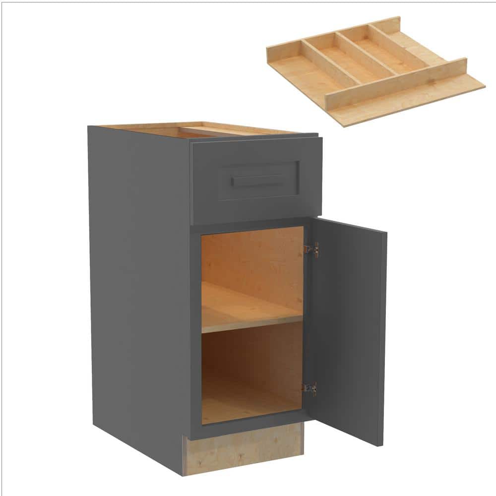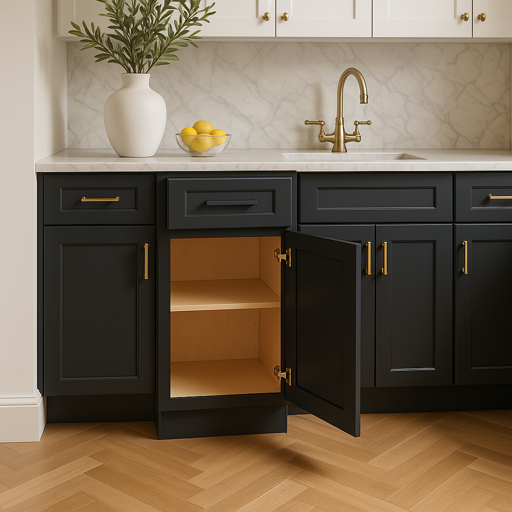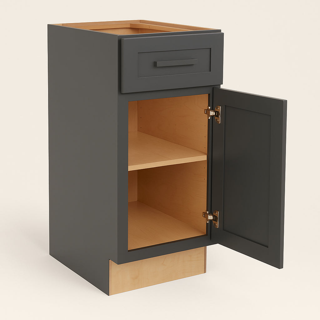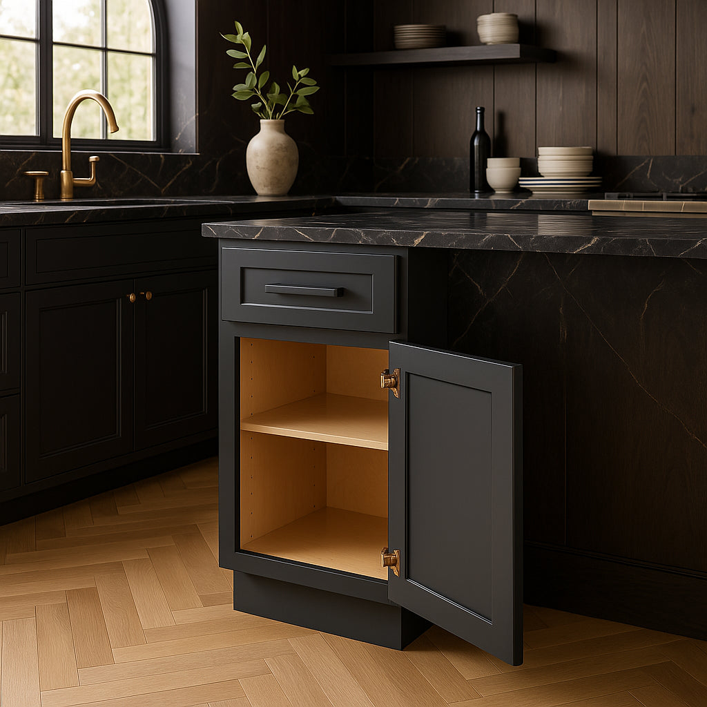 The Grayson Base Kitchen Cabinet in Deep Onyx combines transitional shaker style with functional elegance. Featuring soft-close doors and drawers, robust plywood construction, and a sophisticated finish, it offers both durability and aesthetic appeal.