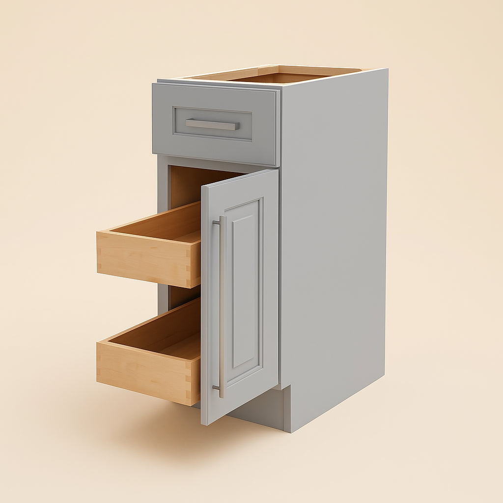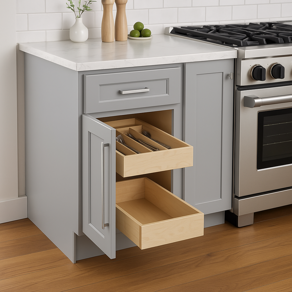The Grayson Pearl Gray Kitchen Cabinet combines transitional shaker design with durable plywood construction. Featuring soft close doors and drawers, a cutlery tray, and roll-out trays, it offers both elegance and practicality for modern kitchens.