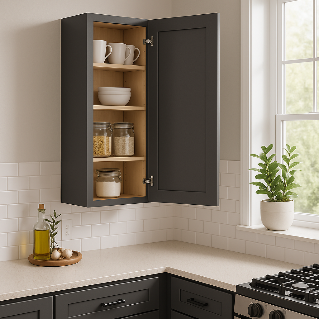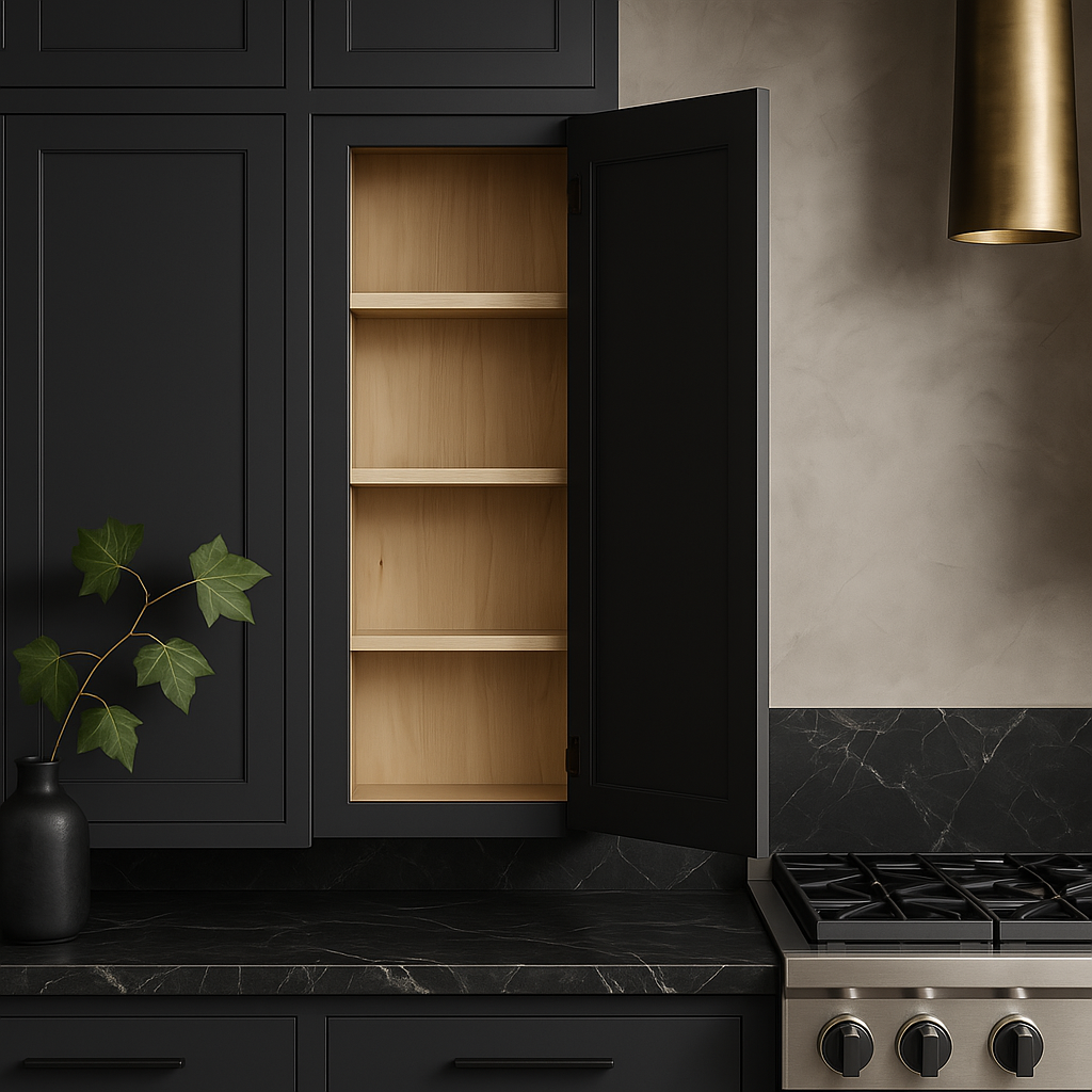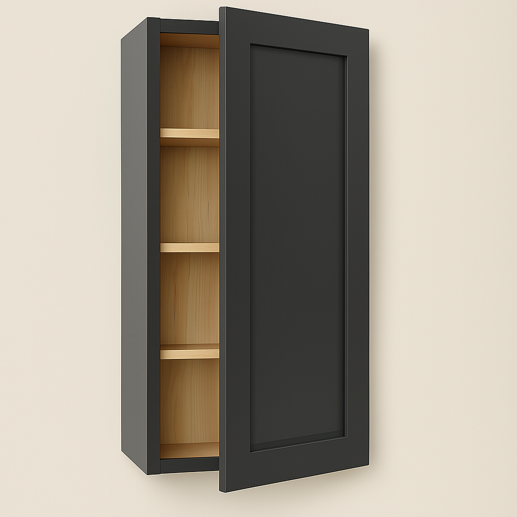 The Grayson Deep Onyx Wall Kitchen Cabinet combines premium plywood construction with a bold painted finish for durability and style. Featuring soft-close doors and adjustable shelves, it offers both functionality and elegance.