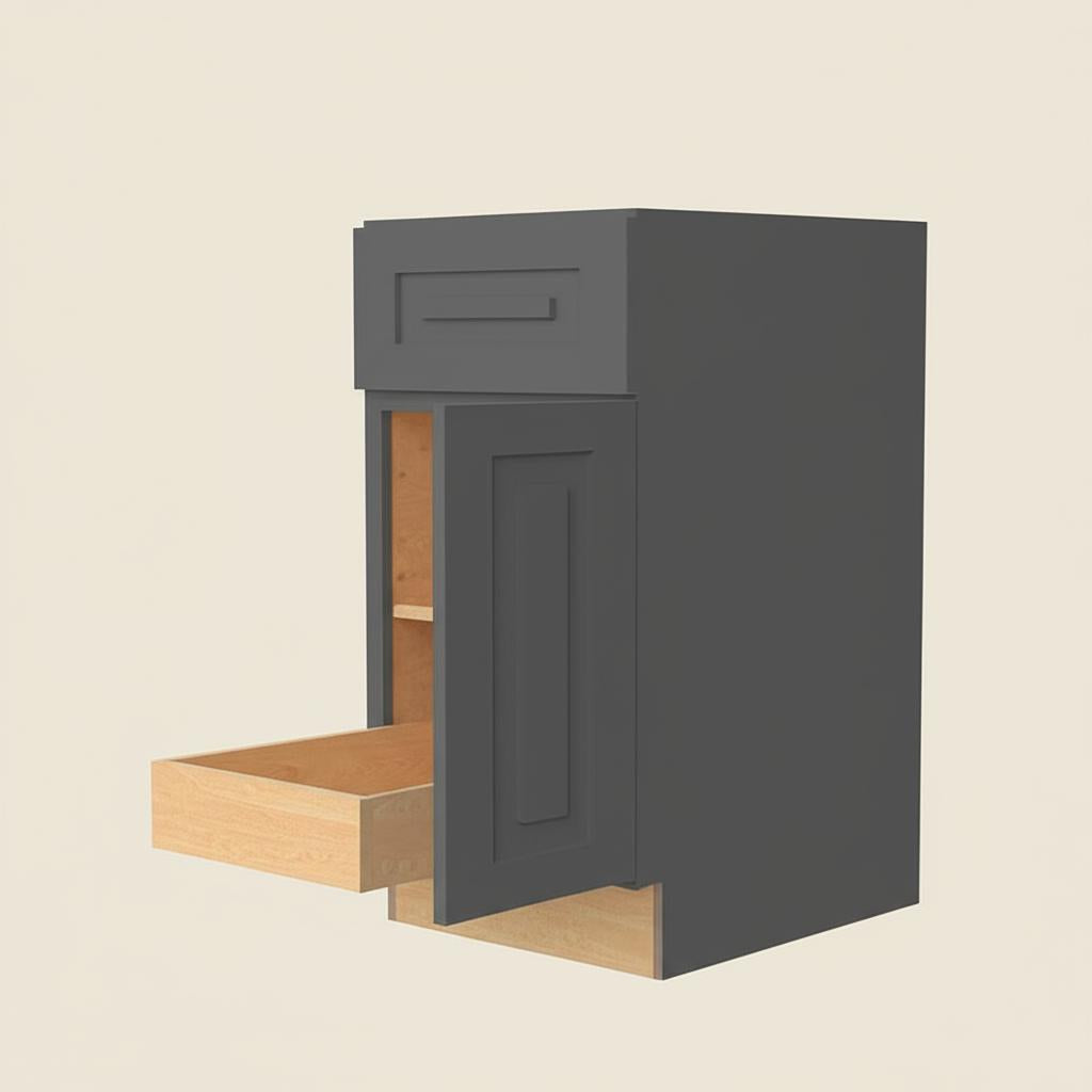 The Grayson Plywood Base Kitchen Cabinet in Deep Onyx is a statement of refined sophistication, blending modern design with practical functionality. Its deep gray finish and shaker-style doors create a versatile aesthetic that complements both contemporary and traditional spaces. Pair it with sleek metal hardware and a marble countertop for a luxurious kitchen ambiance. This cabinet is not just a storage solution but a centerpiece that elevates the entire room.