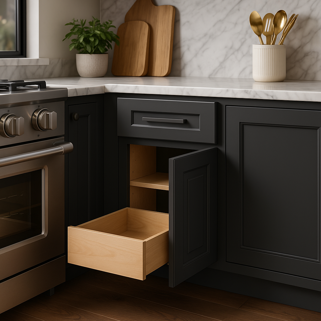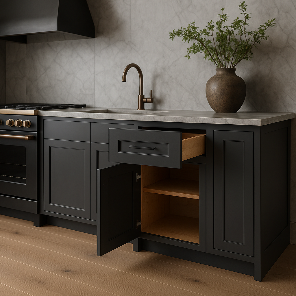 The Grayson Plywood Base Kitchen Cabinet in Deep Onyx combines modern elegance with durable construction. Featuring soft-close doors and drawers, adjustable shelves, and a rich dark gray finish, it is perfect for enhancing both traditional and contemporary kitchen spaces.