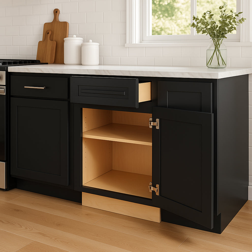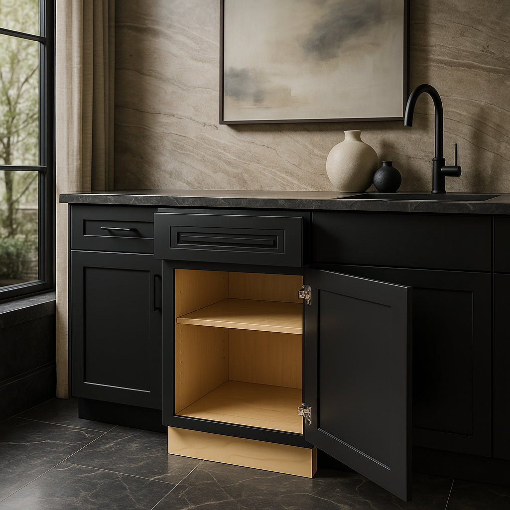 The Grayson Base Kitchen Cabinet in Deep Onyx combines elegant design with durable plywood construction. Featuring soft-close doors and drawers, it offers both style and functionality for a sophisticated kitchen space.