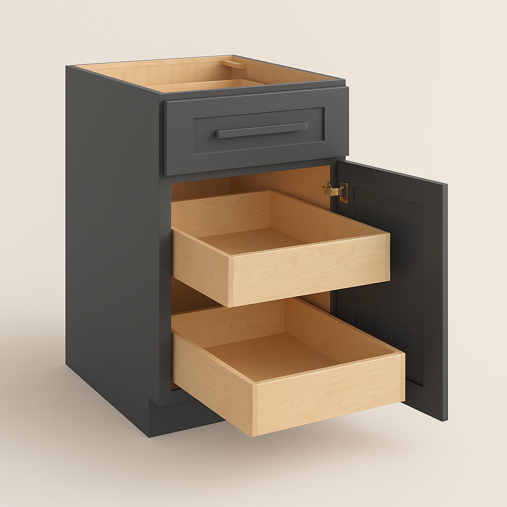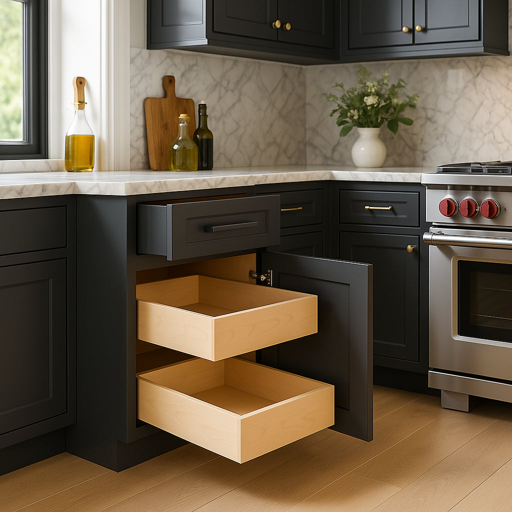 The Grayson Deep Onyx Base Kitchen Cabinet combines modern elegance with durable functionality. Featuring soft-close doors and drawers, premium plywood construction, and a chic transitional Shaker design, this cabinet is perfect for enhancing any kitchen space.