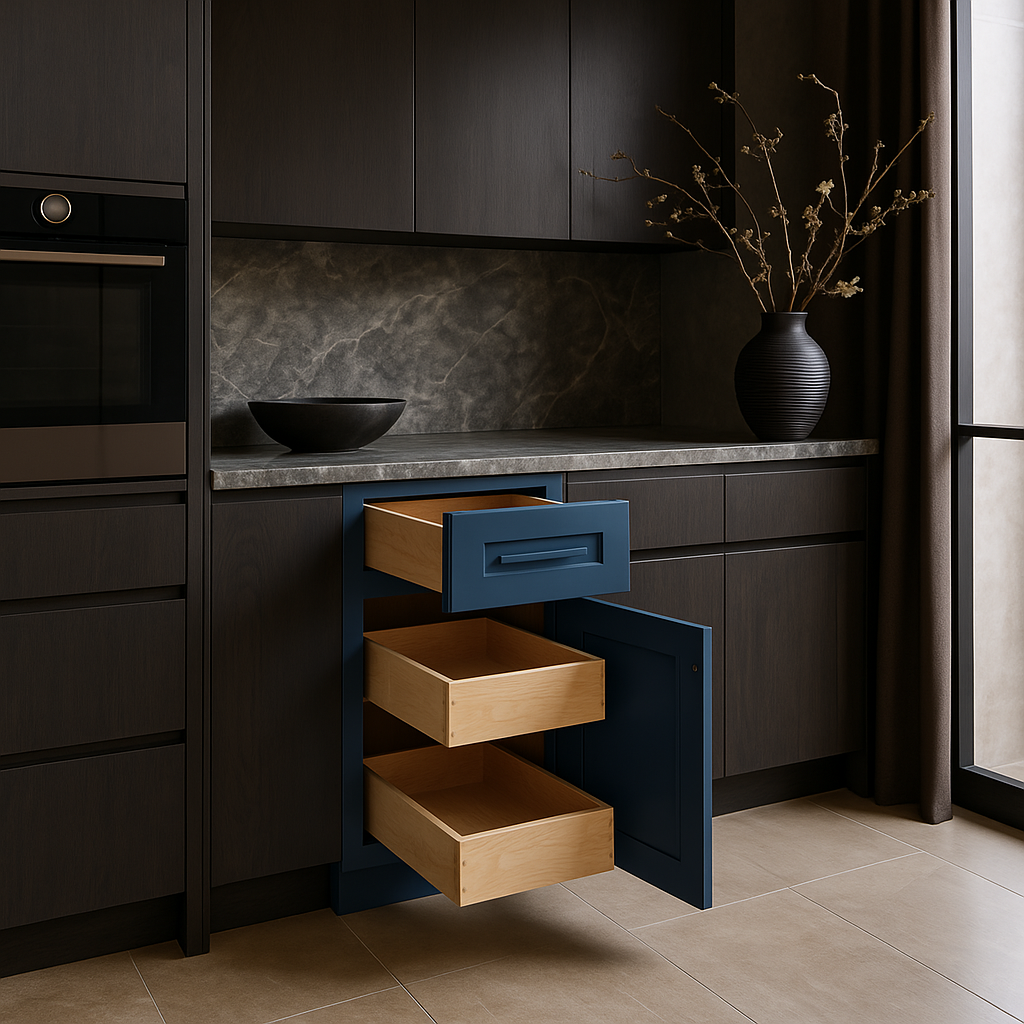 Transform your culinary landscape with the Grayson Mythic Blue Cabinet. Its deep, enigmatic blue hue, combined with the sophisticated transitional Shaker design, injects a timeless sophistication into your kitchen. Imagine pairing this cabinetry with gold hardware and white marble countertops for a stunning contrast or embracing open shelving filled with textured ceramics. Let this piece be the cornerstone of a kitchen that exudes luxury and underscores the comfort of a well-loved home.