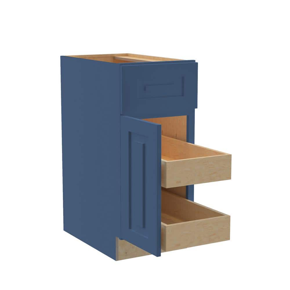 The Grayson Mythic Blue Base Kitchen Cabinet by Home Decorators Collection combines durable plywood construction with a chic dark blue finish. Featuring soft-close technology and a transitional Shaker style, this cabinet is perfect for enhancing your kitchen's elegance and functionality.