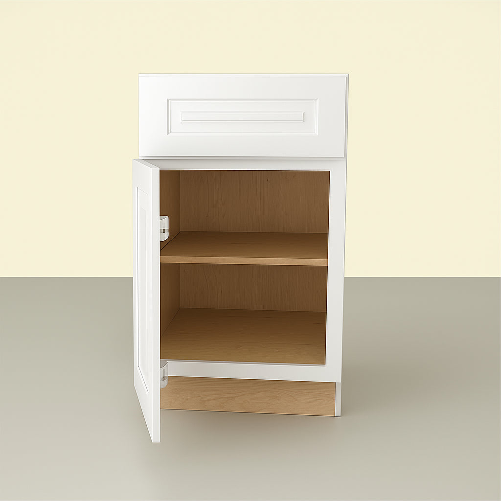 - Elegant Design: Features a raised panel shaker style in a Pacific White finish for a clean, modern aesthetic.