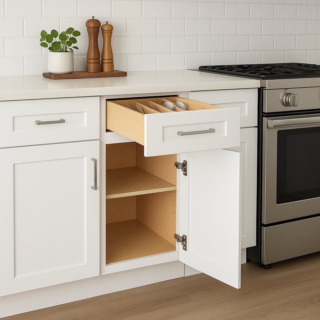 The Grayson Kitchen Cabinet by Home Decorators Collection combines elegance and practicality with its raised panel shaker design in Pacific White. Crafted from durable all-plywood construction, it features soft-close doors and drawers, adjustable shelves, and a full-width utensil compartment for optimized storage.