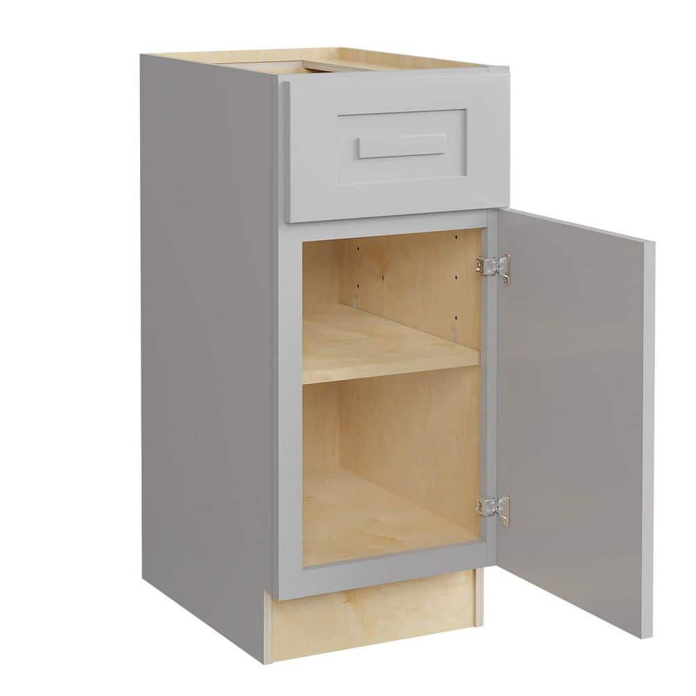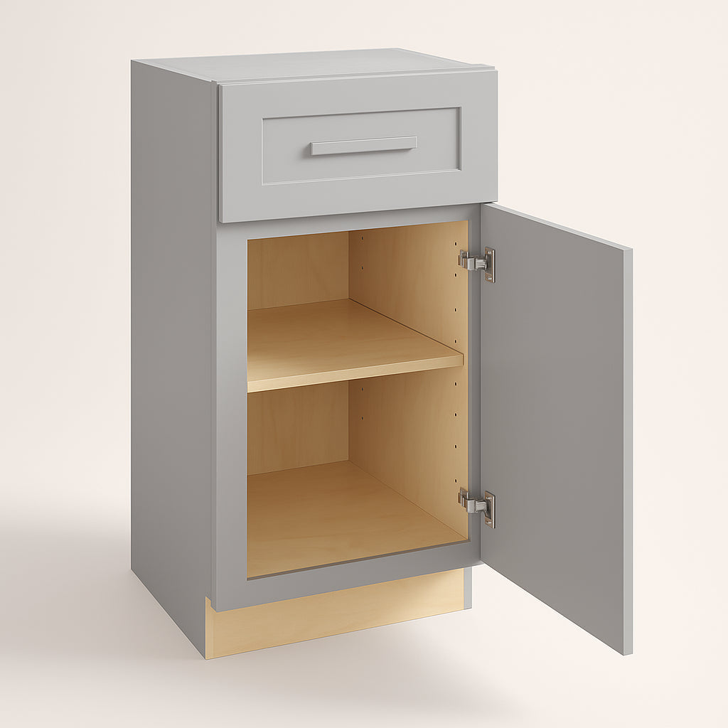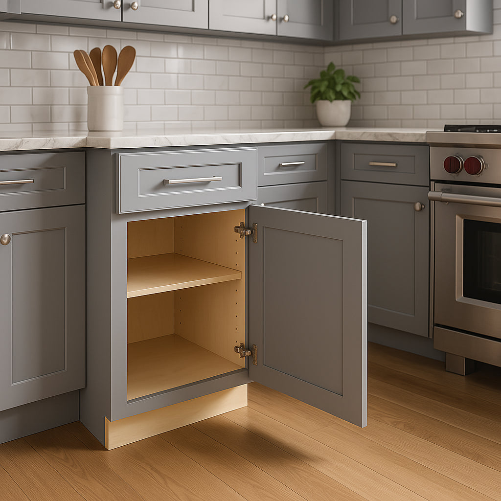 The Grayson Pearl Gray Base Kitchen Cabinet combines style and durability with its soft-close doors, premium plywood construction, and elegant pearl gray finish. Perfect for modern kitchens, it offers adjustable shelves and a transitional shaker design.
