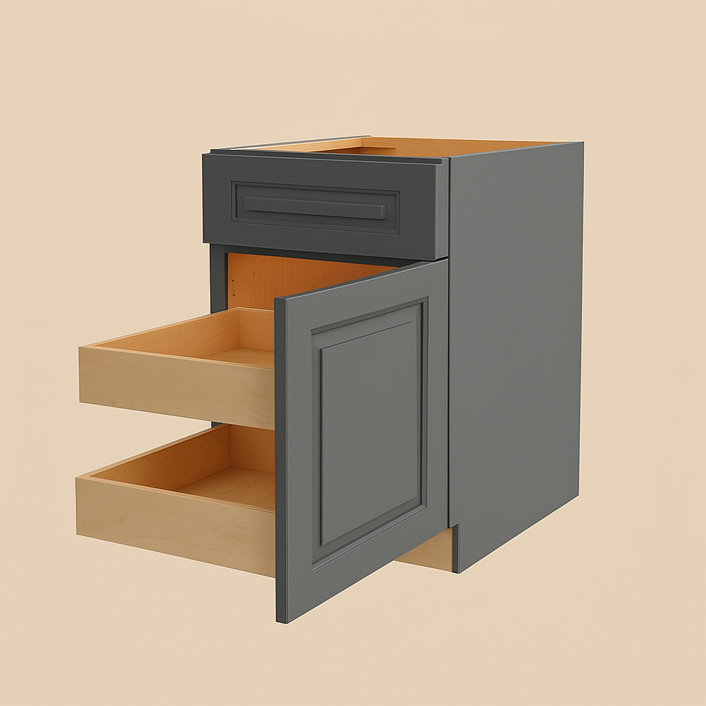 The Grayson Deep Onyx Base Kitchen Cabinet combines modern design with durable plywood construction. Featuring soft close technology and a striking dark gray finish, it offers both style and functionality for your kitchen.