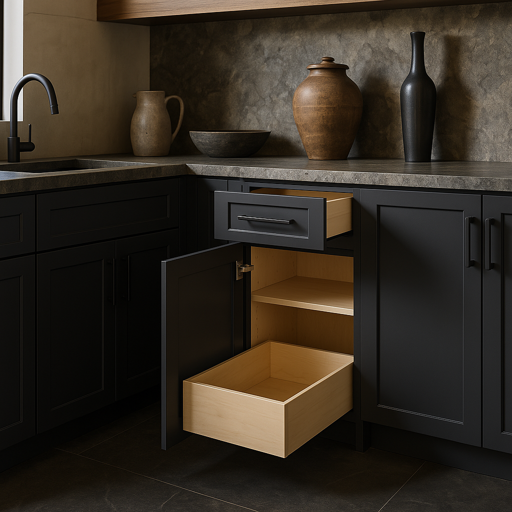 The Grayson Deep Onyx Kitchen Cabinet is a masterpiece of design and functionality, seamlessly blending into any modern or transitional kitchen. Its rich, dark finish creates a striking contrast against lighter countertops or backsplashes, while the soft-close features add a touch of luxury to everyday use. Pair it with metallic accents or natural wood tones to create a balanced and inviting space. This cabinet is not just a storage solution but a statement piece that elevates the aesthetic of your kitchen.