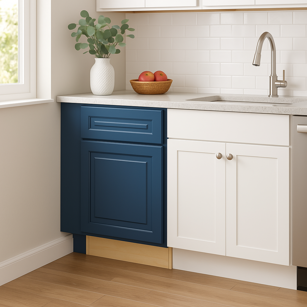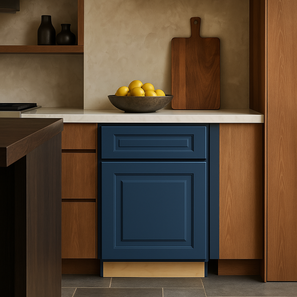 The Grayson base cabinet in Mythic Blue is a masterpiece of design and functionality, perfect for elevating your kitchen's aesthetic. Its deep blue finish exudes sophistication, while the soft-close mechanisms ensure a seamless and quiet experience. Pair it with brass hardware and marble countertops to create a timeless and luxurious space. This cabinet is not just a storage solution but a statement piece that transforms your kitchen into a haven of style and elegance.