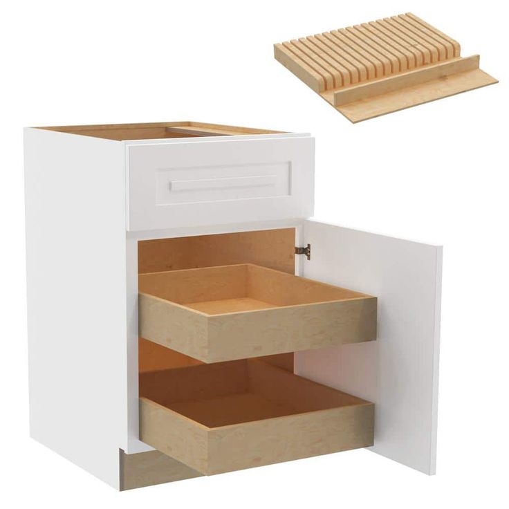 A: The cabinet comes with 2 soft close roll out trays and a knife block insert to help keep your kitchen organized.