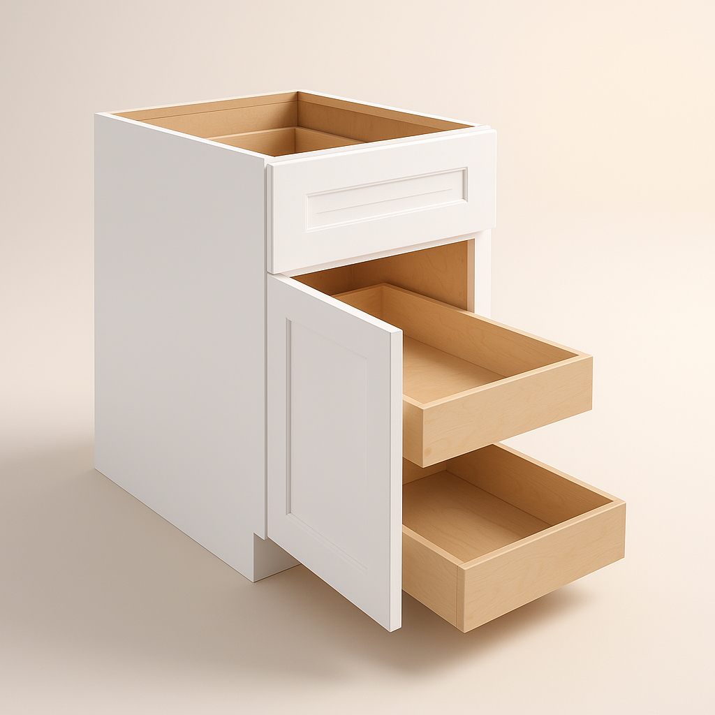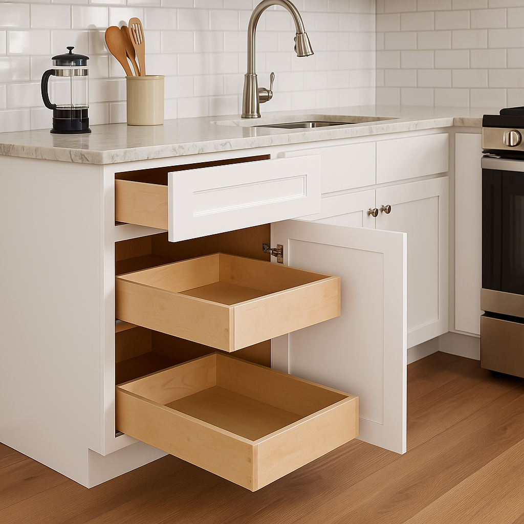 - Optimized Storage: Equipped with full-depth shelves, roll-out trays, and a spice tray insert for efficient organization.