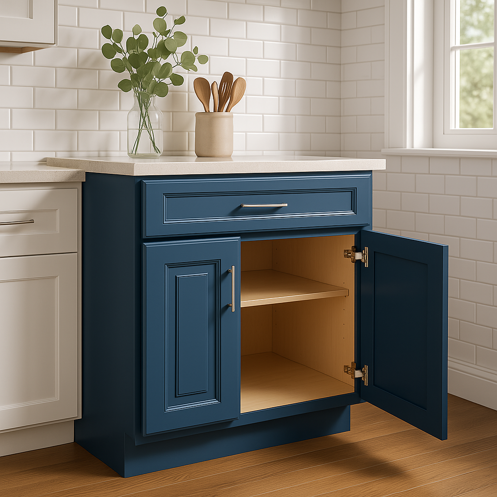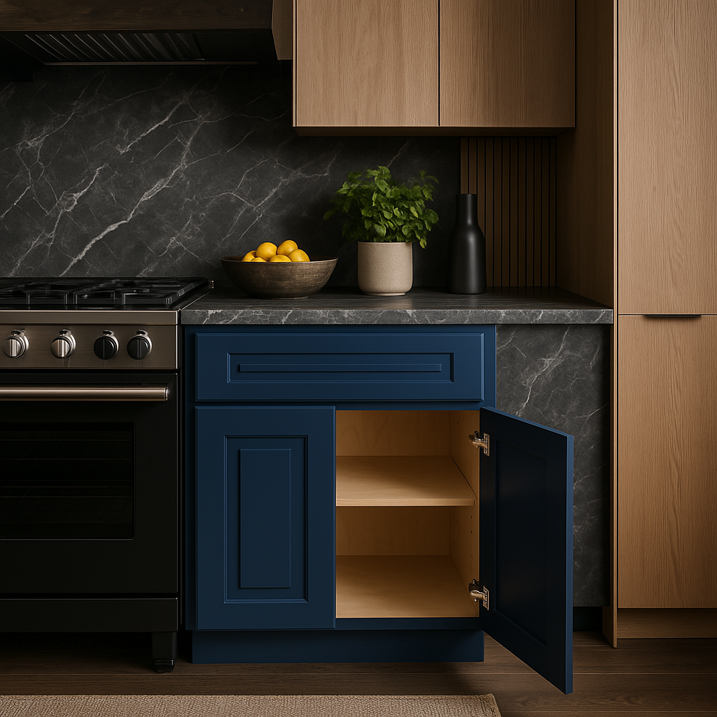 The Grayson Mythic Blue Cabinet is a masterpiece of design and functionality, perfect for elevating your kitchen space. Its deep blue finish exudes sophistication, while the soft-close doors and drawers add a touch of luxury to everyday use. Pair it with light marble countertops to create a striking contrast that highlights its modern charm. This cabinet is not just a storage solution but a statement piece that defines elegance and practicality.