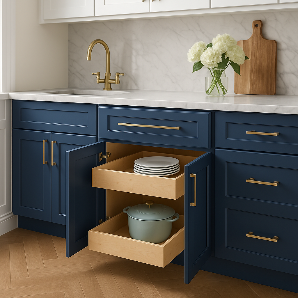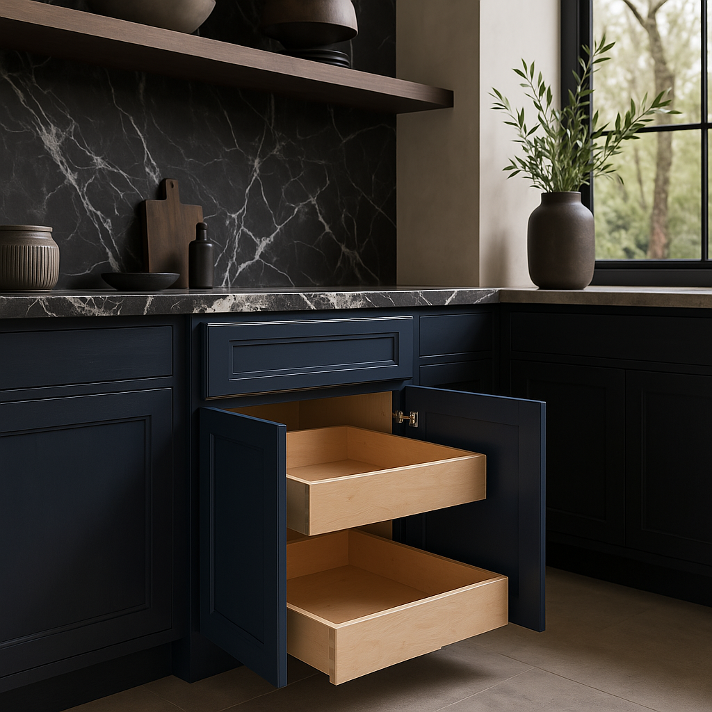 The Grayson Kitchen Cabinet in Mythic Blue combines timeless elegance with modern functionality. Featuring all-plywood construction, soft-close doors and drawers, and a deep blue finish, it is both durable and stylish.