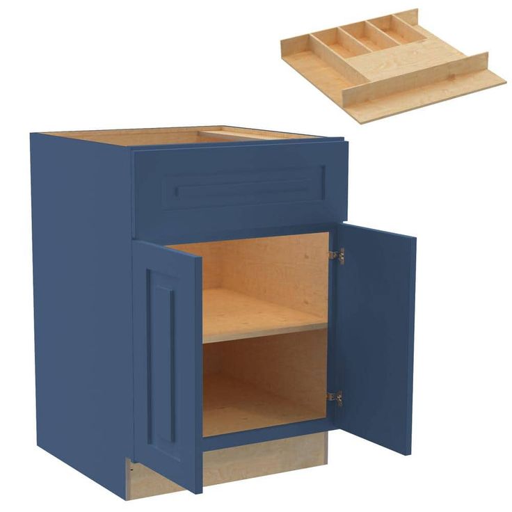 Enhance your kitchen's elegance with the Home Decorators Collection's Grayson Base Kitchen Cabinet, featuring a stunning Mythic Blue finish. This 24-inch wide cabinet offers contemporary shaker styling and a soft-close cutlery drawer for smooth operation. Built with durable plywood, it combines style, functionality, and longevity for professional-grade kitchen spaces.