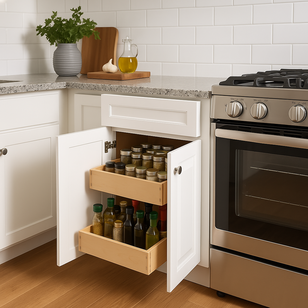 The Grayson kitchen cabinet is a masterpiece of design and functionality, offering a clean Pacific White finish that brightens any culinary space. Its soft-close doors and drawers add a touch of sophistication, while the integrated spice and utensil trays ensure effortless organization. Pair this cabinet with sleek chrome fixtures and marble countertops to create a kitchen that exudes luxury and charm. This cabinet is not just a storage solution but a statement of refined taste and quality.